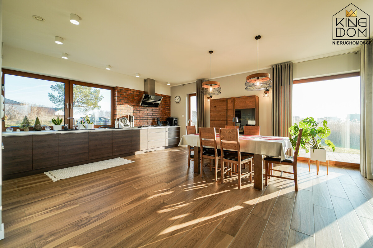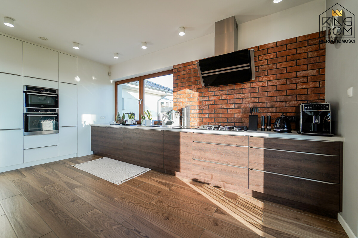 - nowoczesna kuchnia w zabudowie ze sprzętami AGD ( lodówka, piekarnik elektryczny, piekarnik parowy, płyta gazowa, zmywarka, okap) oraz wydzieloną strefą jadalnianą,