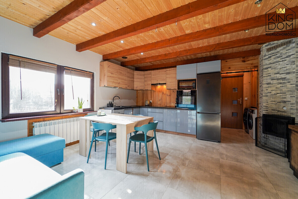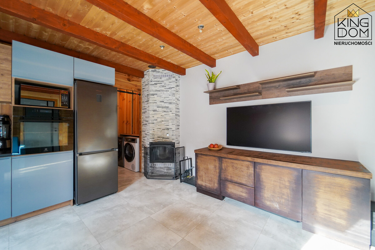 - salon z kominkiem oraz aneksem kuchennym w zabudowie ze sprzętami AGD,