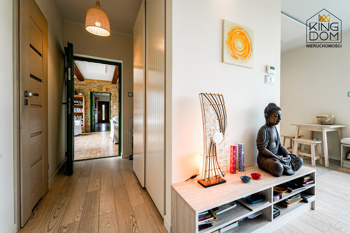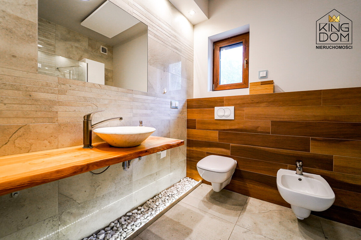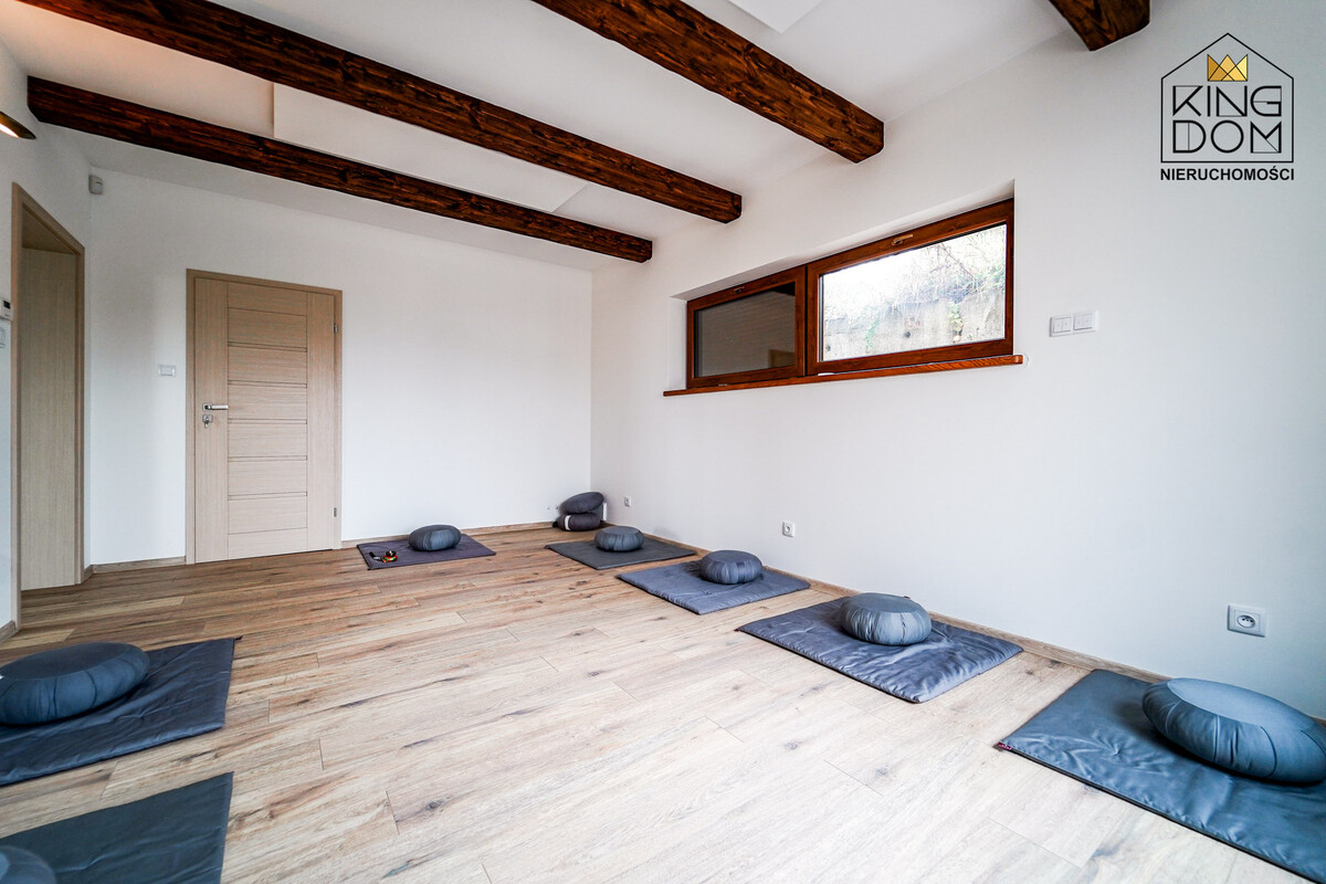 Przy jednym z nich znajduje się oryginalnie zaprojektowana łazienka z naturalnymi kamieniami podświetlanymi ciepłym światłem. Drugi pokój obecnie pełni funkcję sali do medytacji. W domu została także wydzielona część gospodarcza, stanowiąca pralnię i suszarnię.