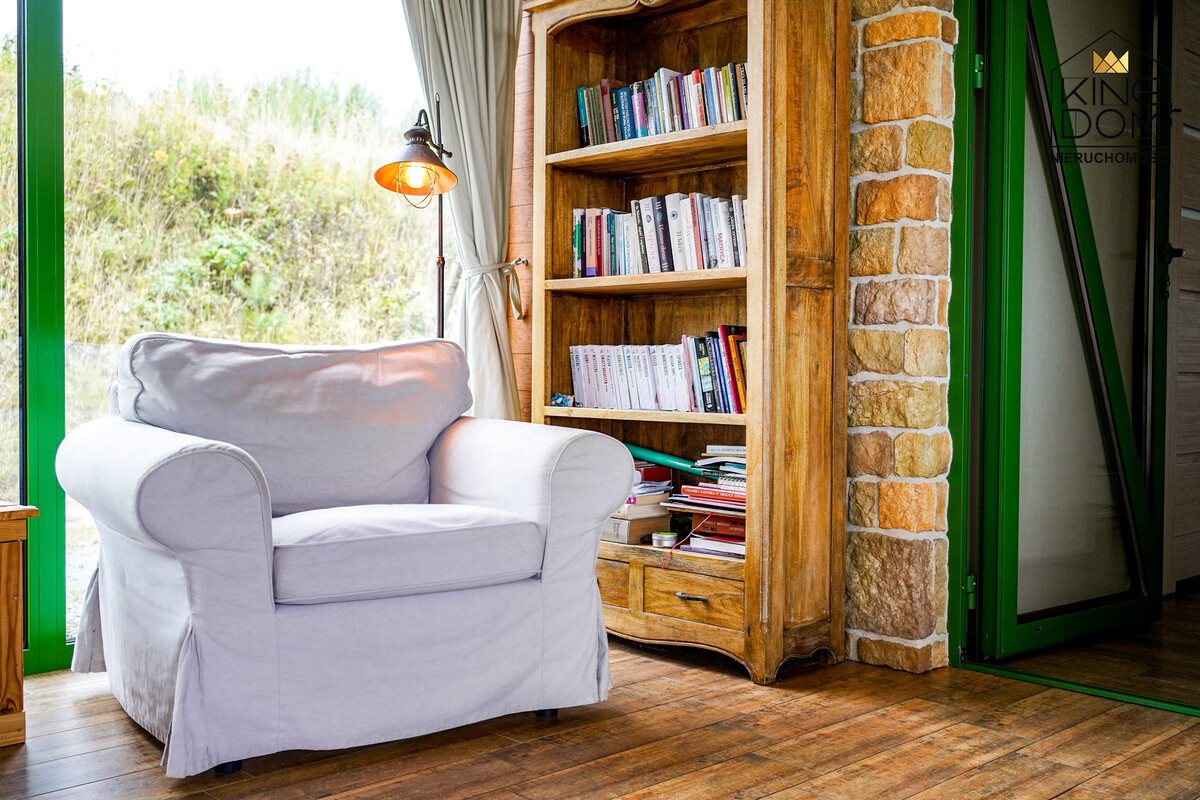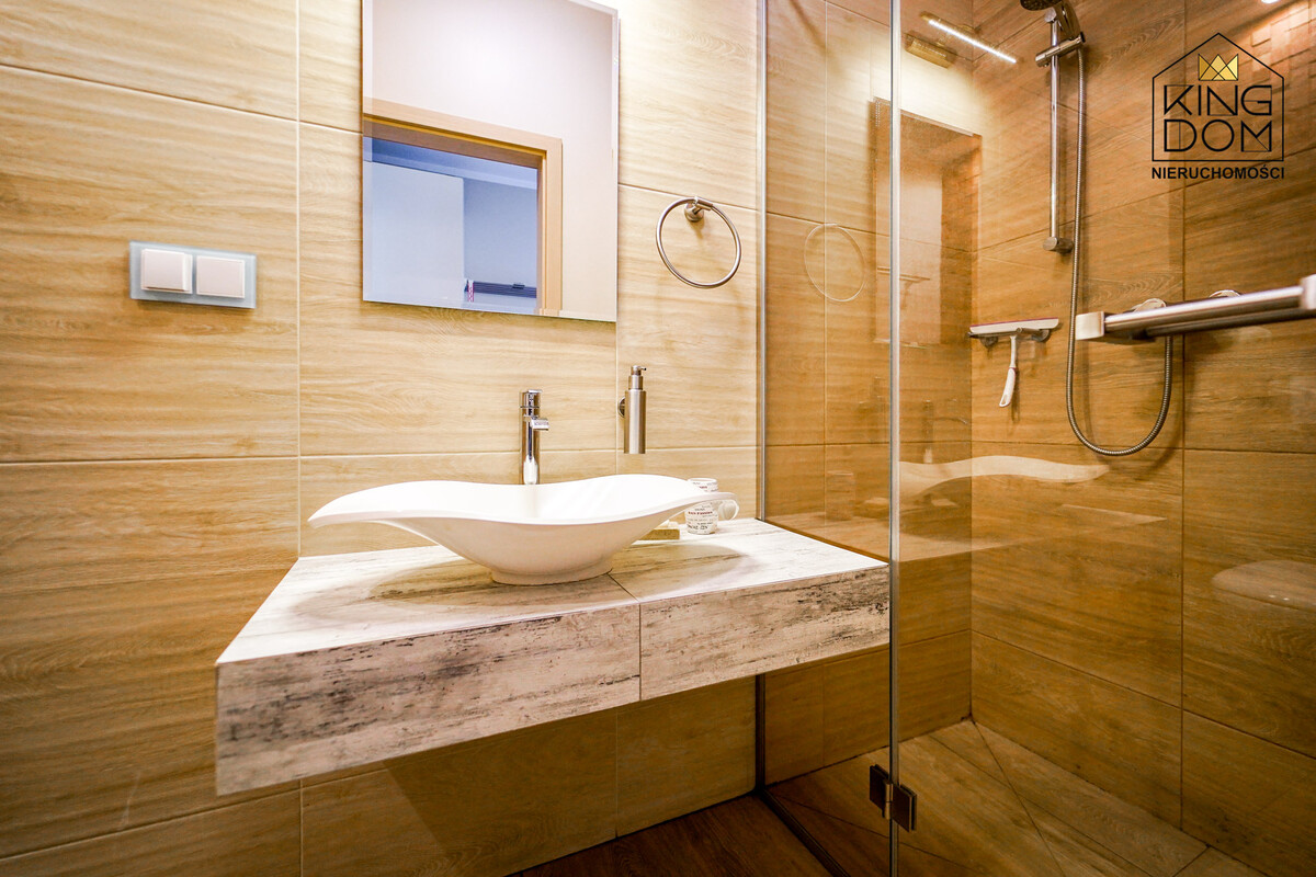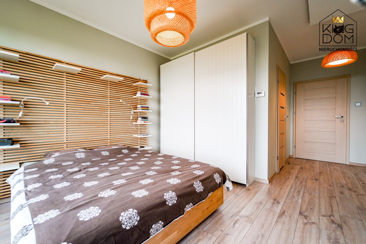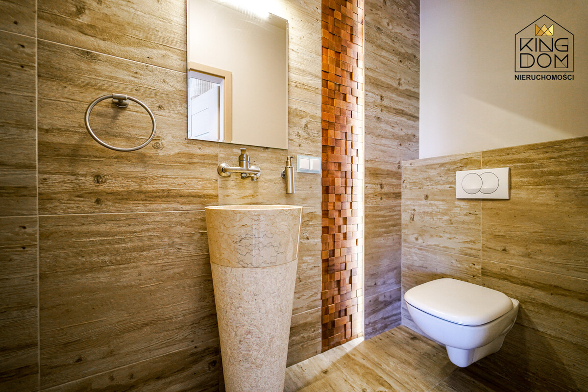 Przy jednym z nich znajduje się oryginalnie zaprojektowana łazienka z naturalnymi kamieniami podświetlanymi ciepłym światłem. Drugi pokój obecnie pełni funkcję sali do medytacji. W domu została także wydzielona część gospodarcza, stanowiąca pralnię i suszarnię.