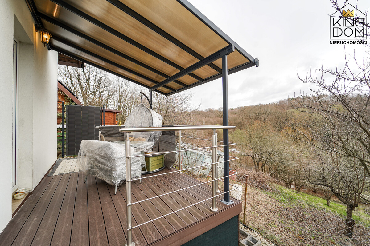 Na zewnątrz posesji znajduje się przestronny, zadaszony taras, który stanowi idealne miejsce na poranną kawę, rodzinny obiad na świeżym powietrzu czy wieczornego grilla w gronie przyjaciół. Dopełnieniem funkcjonalności ogrodu są dwa estetyczne pomieszczenia gospodarcze, które pomieszczą narzędzia ogrodowe, czy sprzęt sezonowy.