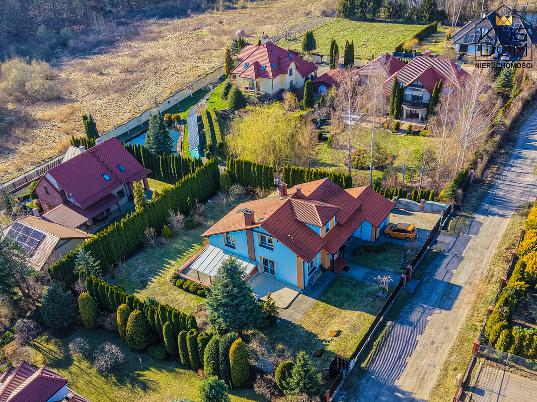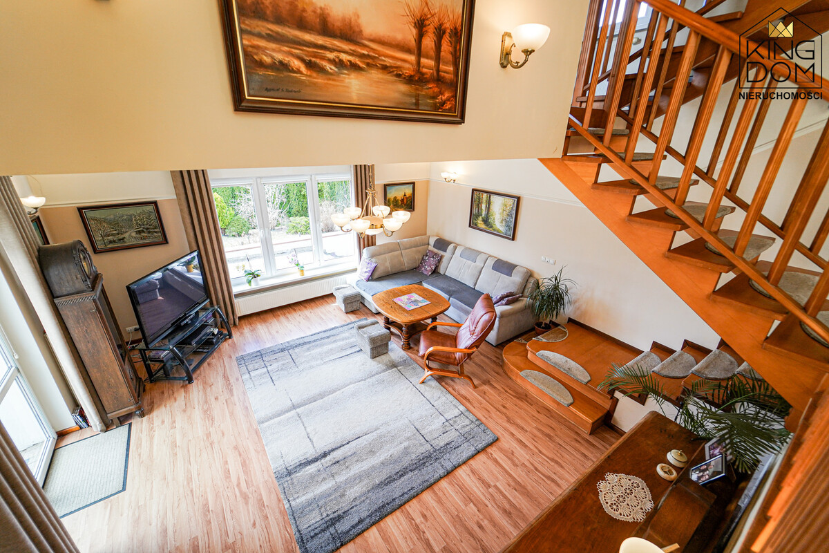 Nieruchomość powstała według indywidualnego projektu, co odróżnia ją od powtarzalnych domów z katalogu. Przemyślany układ funkcjonalny zapewnia domownikom wyjątkowe poczucie prywatności. Wnętrze wyróżnia się niezwykle ciekawym wykorzystaniem antresoli, na której zorganizowano przestronną kuchnię oraz jadalnię. Sercem domu jest salon z kominkiem, który posiada system rozprowadzenia ciepła do pozostałych pokoi. To rozwiązanie nie tylko buduje wyjątkowy klimat w zimowe wieczory, ale stanowi również efektywne, alternatywne źródło ogrzewania.