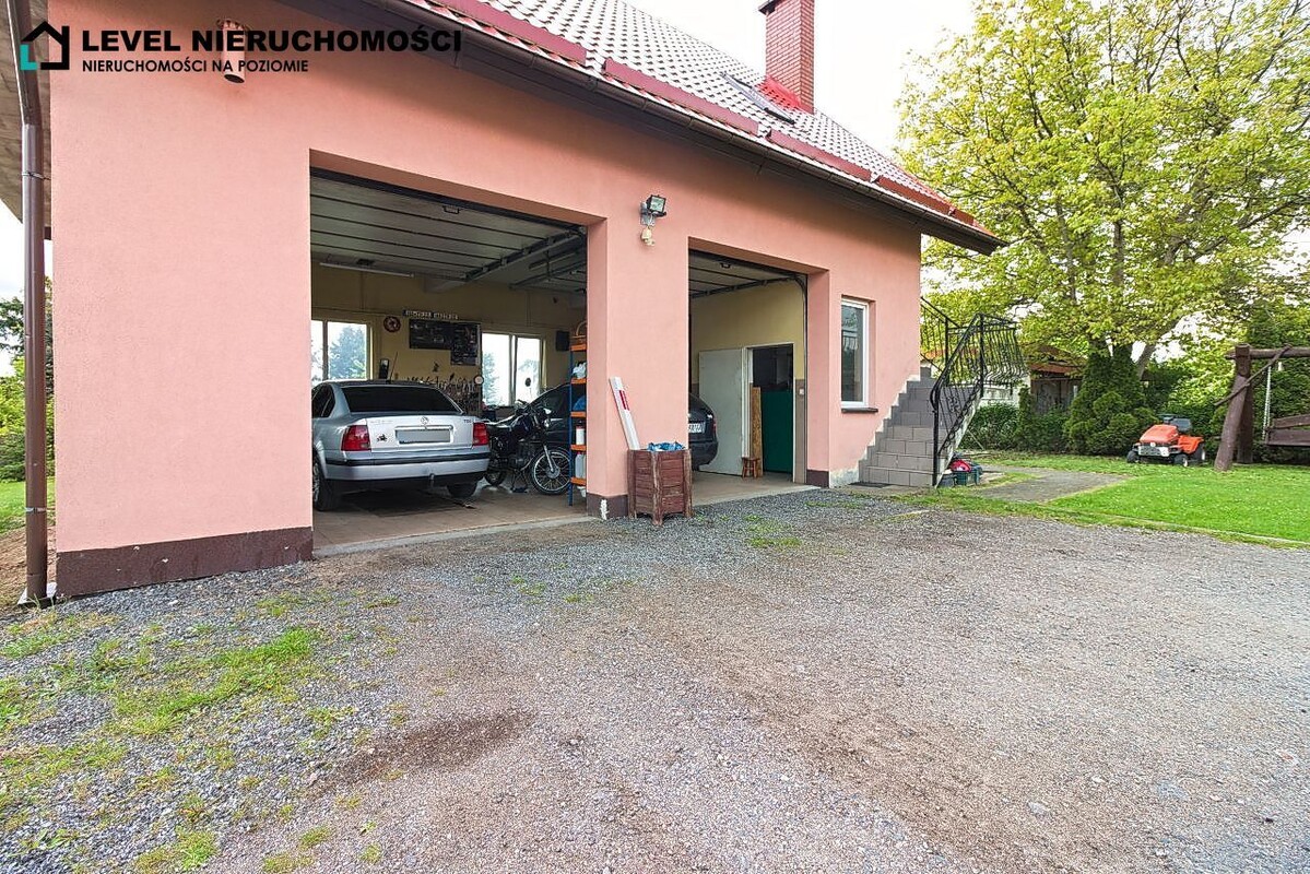 Warsztat wolnostojący posiada dwa stanowiska z dużymi bramami wjazdowymi, kotłownię, sanitariaty oraz mieszkanie dwupokojowe z balkonem na pierwszym piętrze.