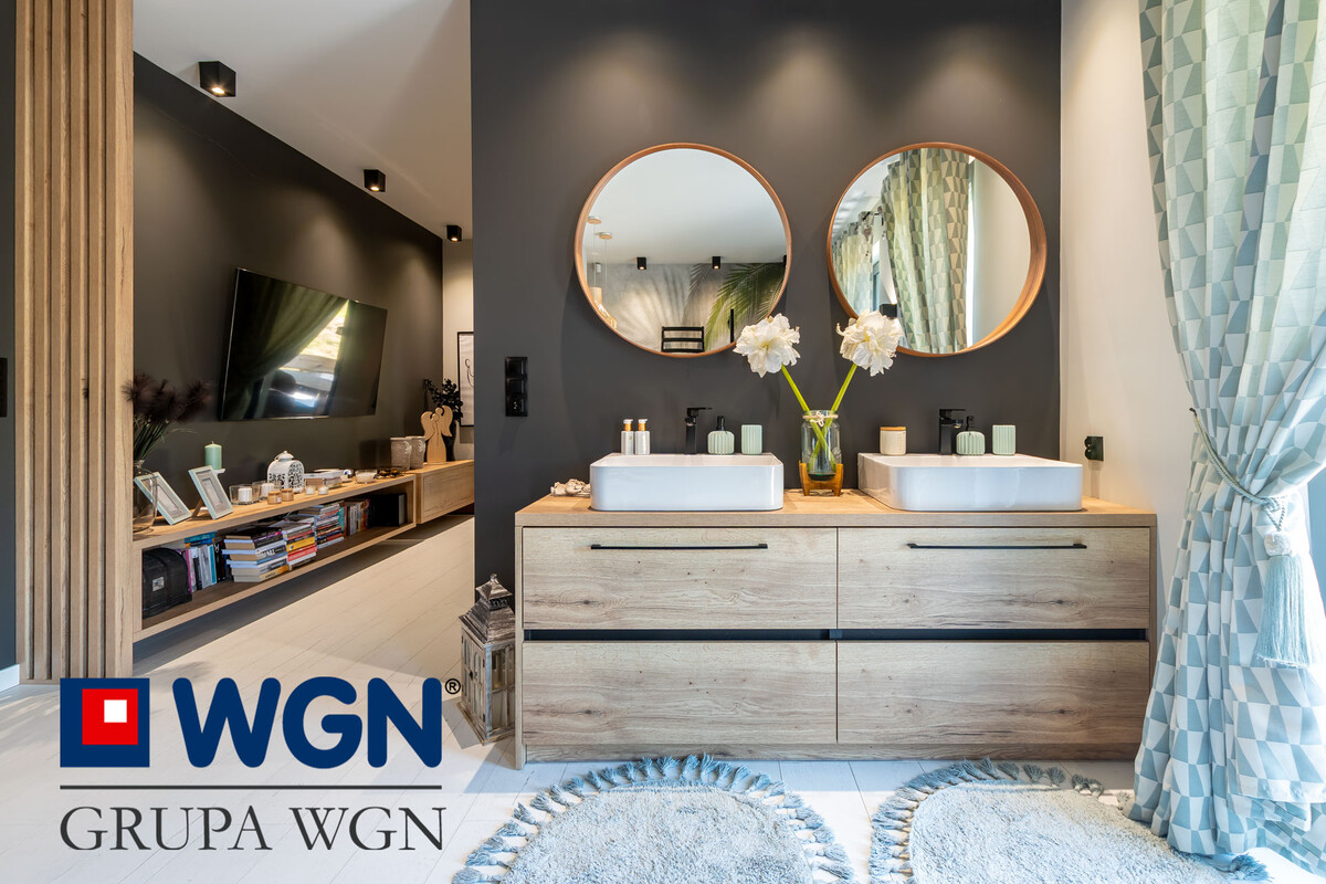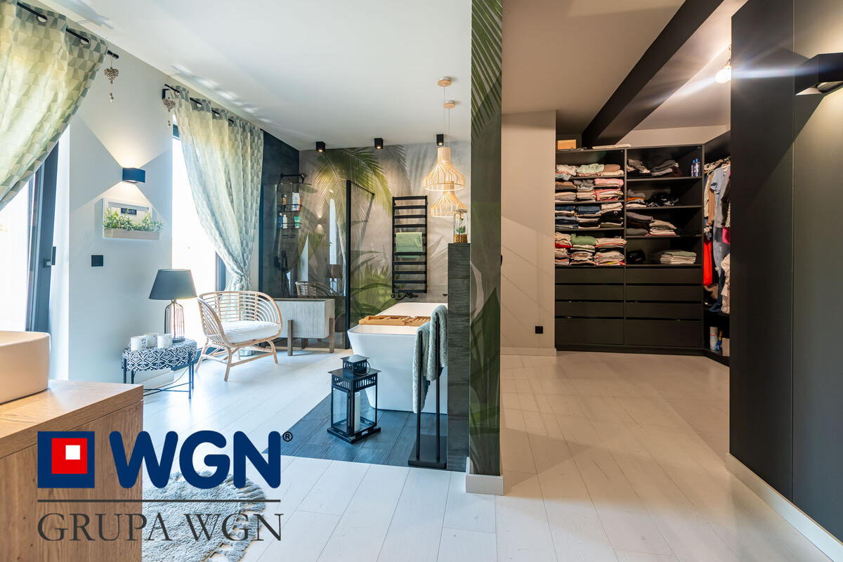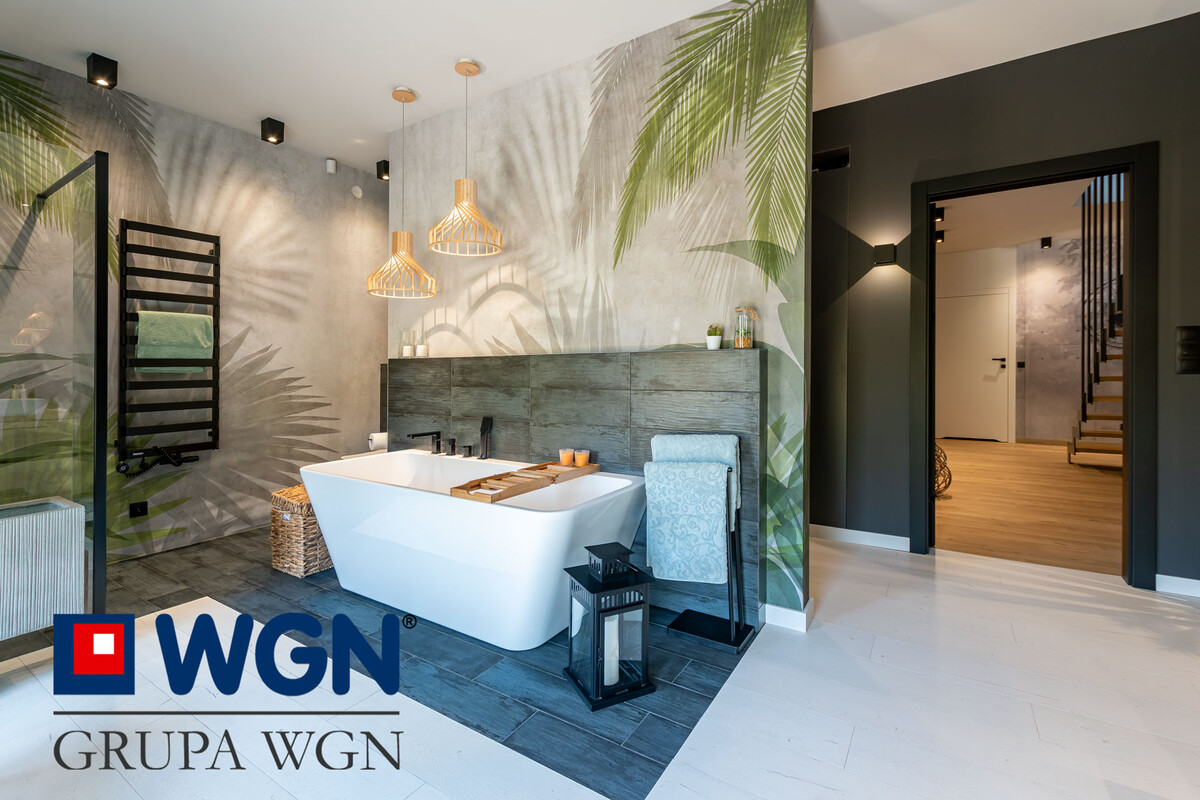 Nieruchomość zaaranżowana tak aby spełnić oczekiwania najbardziej wymagających klientów. Sam projekt przygotowany przez ML Studio Moniki Leszczyńskiej daje nam gwarancję idealnego wnętrza, pięknie przygotowanego, w nowoczesnych kolorach z użytymi materiałami wysokiej jakości. Przekraczając próg domu, już możemy zauważyć piękną tapetę oraz duże szklane drzwi w kolorze czarnym, które nam mówią że tu po prostu jest pięknie i nowocześnie.