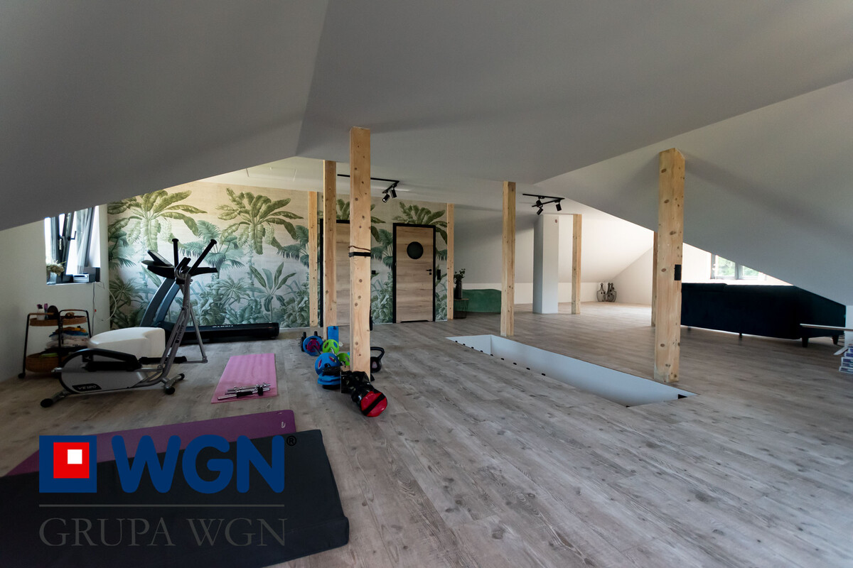 Poddasze nieruchomości to otwarta przestrzeń o powierzchni 75,76m2. Zaaranżowana aktualnie na siłownie, kącik do pracy i kącik telewizyjny. Mamy tam dodatkowe WC i pomieszczenie gospodarcze. ML Studio zaprojektowało także to miejsce i właściciel posiada projekt zagospodarowania tej przestrzeni z podziałem na kilka pokoi, lub jako oddzielne mieszkanie.