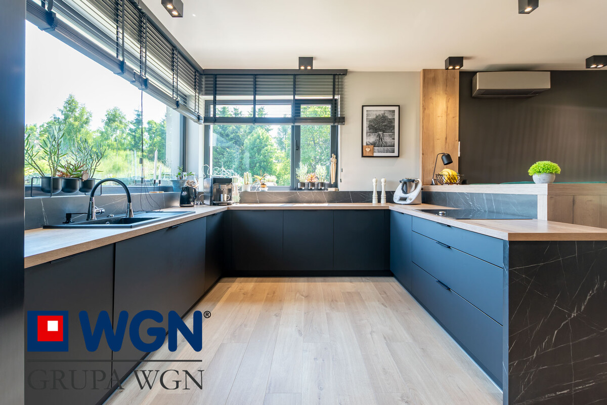 Ważną częścią nieruchomości jest przestronny salon z jadalnią i otwartą kuchnią o łącznej powierzchni ponad 54m2. Kuchnia w literę "U" z dużym blatem roboczym w kolorze dębowym, duże szafki i szuflady z miejscem do przechowywania oraz nowoczesnymi sprzętami AGD w kolorze czarnym w większości firmy Samsung, to tylko krótka charakterystyka tej kuchni. Kuchnia jasna, pełna światła dziennego dzięki dużym narożnym oknom, przez które możemy zobaczyć całość podjazdu oraz część ogrodu. Nowoczesne rolety w oknach przygotowane na wymiar, robią niesamowite wrażenie. Do tak pięknej kuchni, nie mogło zabraknąć równie pięknej jadalni, która składa się z dużego stołu z blatem drewnianym, przy którym każde spotkanie z bliskimi, czy rodzinne śniadanie będzie niezapomniane. W salonie znajduje się klimatyzacja oraz kominek, który z pewnością umili każdy wieczór. Salon z dużą narożną kanapą, to idealne miejsce do odpoczynku, przy dobrej książce, czy spędzając z rodziną przy ulubionym filmie. Ściana telewizyjna to kolejne akcenty przygotowane przez projektantkę, lamele, czarna ściana oraz duża szafka rtv, nawiązująca kolorystycznie do reszty mebli, to robi po prostu wrażenie i warto przyjść i poczuć ten klimat na żywo.