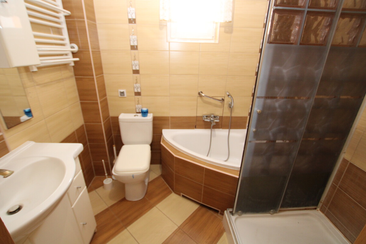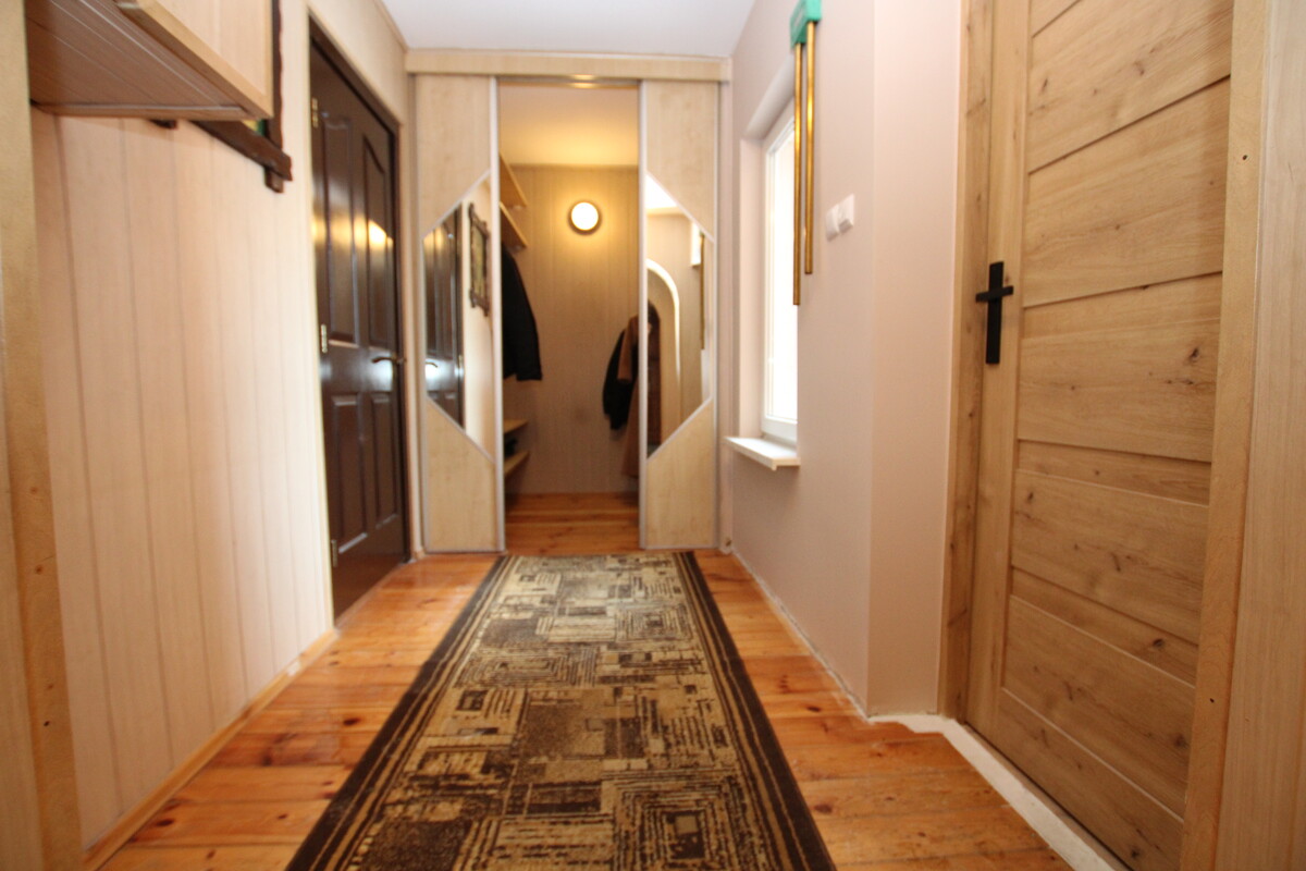 Prywatna strefa na piętrze oferuje trzy ustawne sypialnie oraz łazienka wyposażona zarówno w wannę, jak i kabinę prysznicową, wykończona estetyczną glazurą. Oryginalnym rozwiązaniem jest przejście z jednej z sypialni na przestronny górny taras, który stanowi dodatkową przestrzeń rekreacyjną. Dla osób potrzebujących jeszcze większej powierzchni, dom oferuje strych z wydzielonym już pokoikiem oraz ogromnym potencjałem dalszej adaptacji.