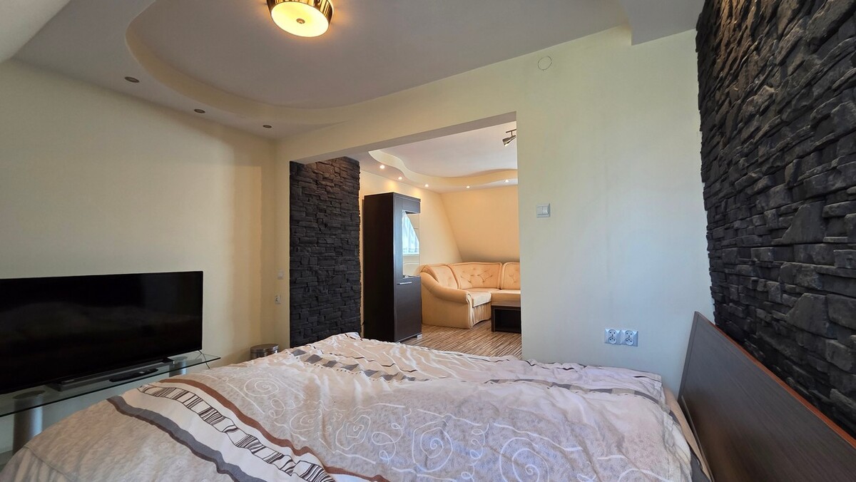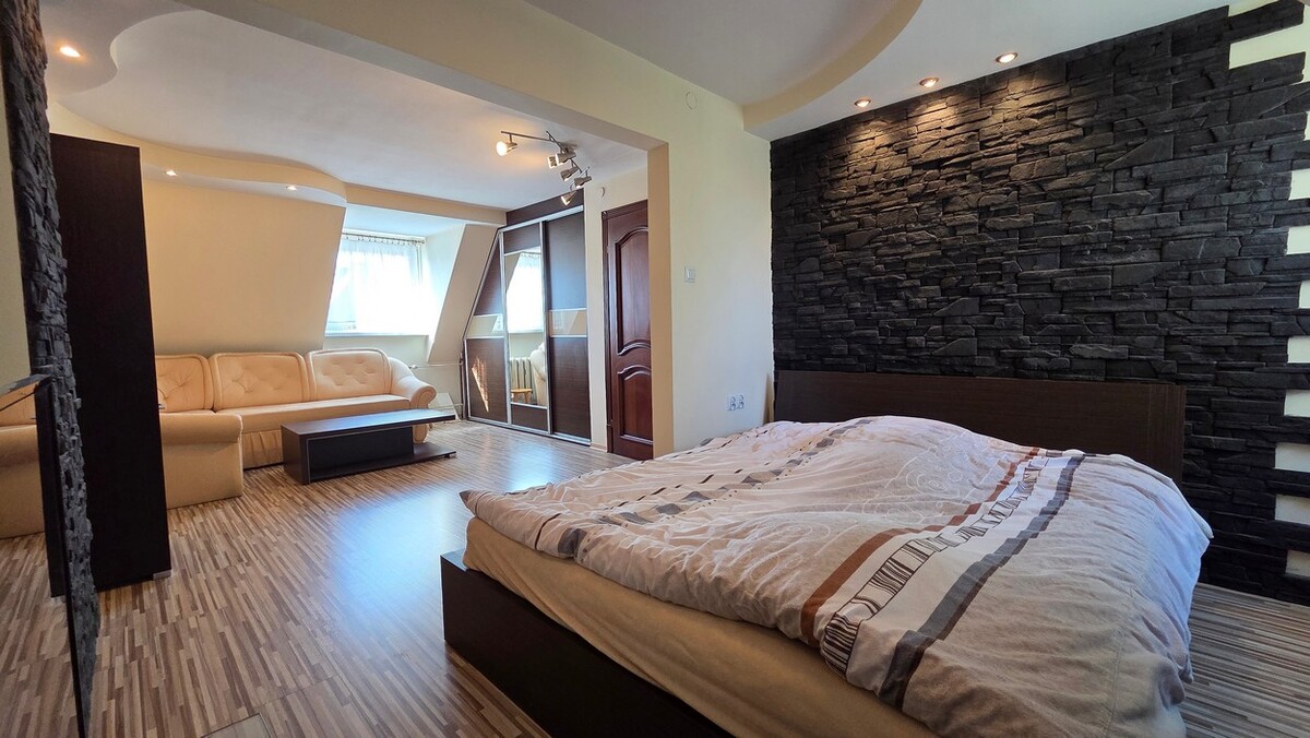 Piętro: 1 duży pokój z łóżkiem oraz dodatkową kanapą, zabudowa szafy, oraz łazienka z WC.