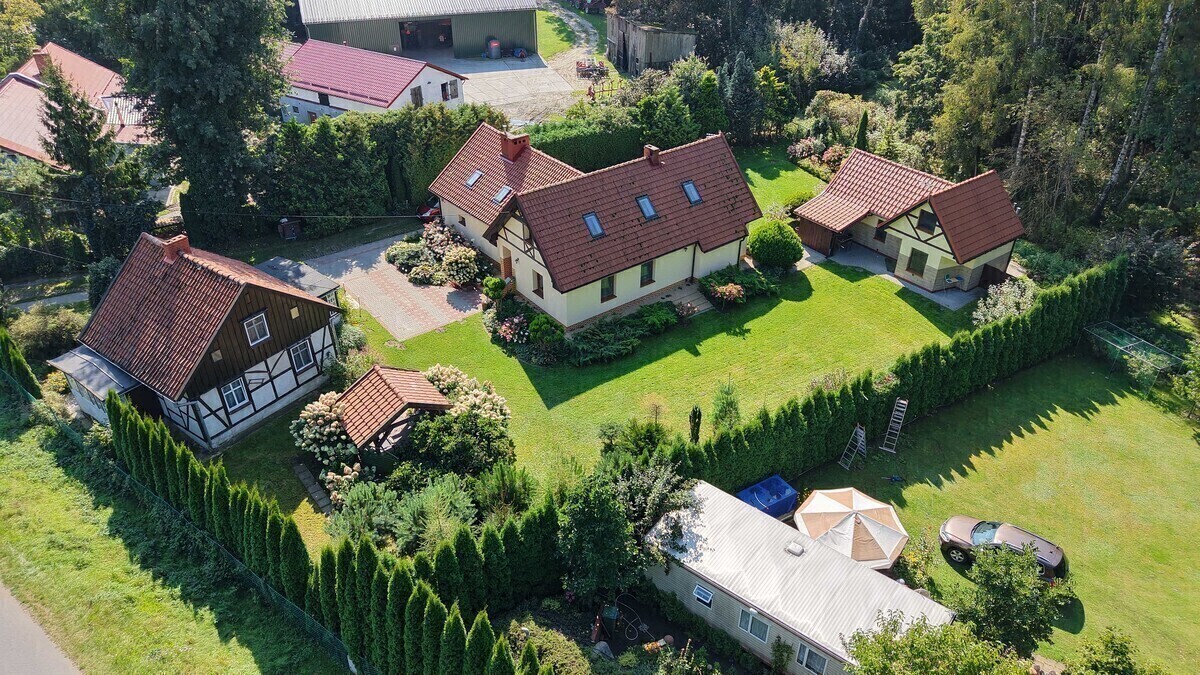 Piętrowy budynek przedwojenny o powierzchni 64 m2 na parterze, piętro stanowi użytkowy strych. Jest wpisany do gminnej ewidencji zabytków, co oznacza, że nie nakłada na właścicieli obowiązków związanych z jego ochroną i konserwacją, jak w przypadku wpisu do rejestru zabytków. Dom jest podłączony do sieci elektrycznej, ale jej użytkowanie wymaga wymiany instalacji.