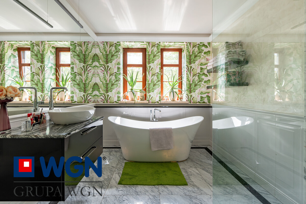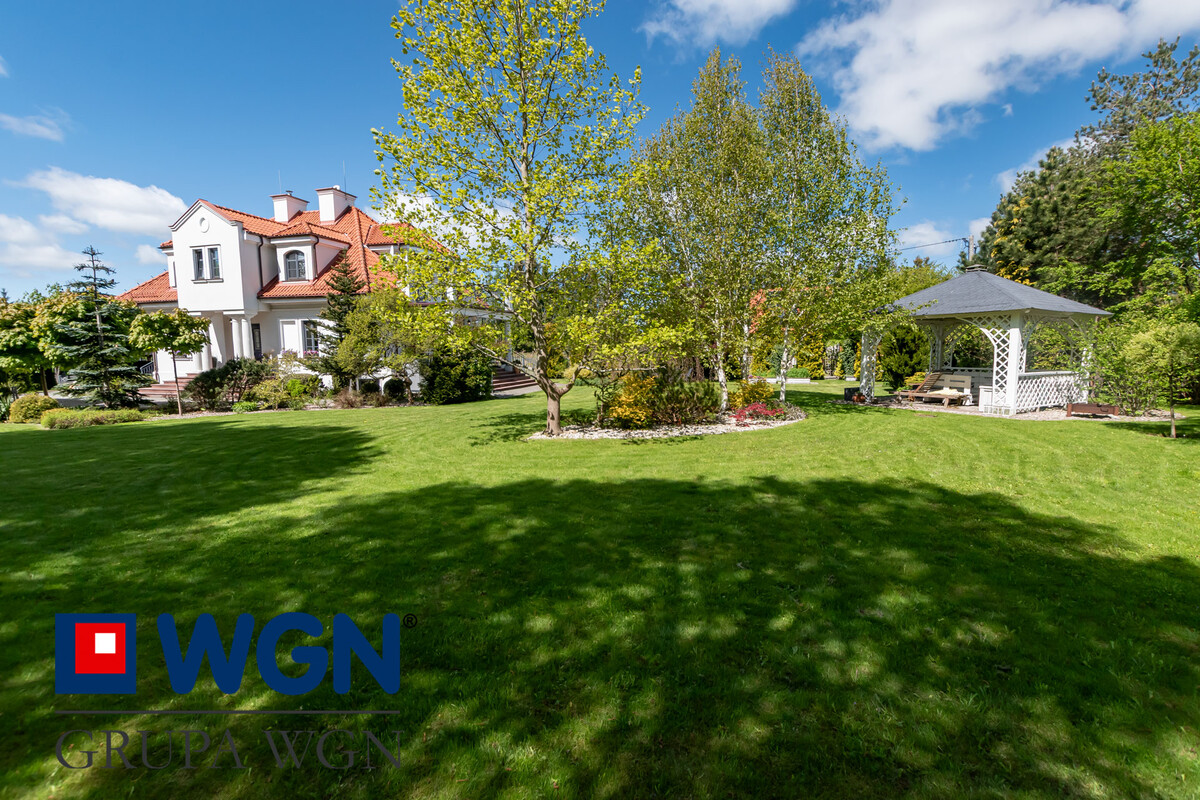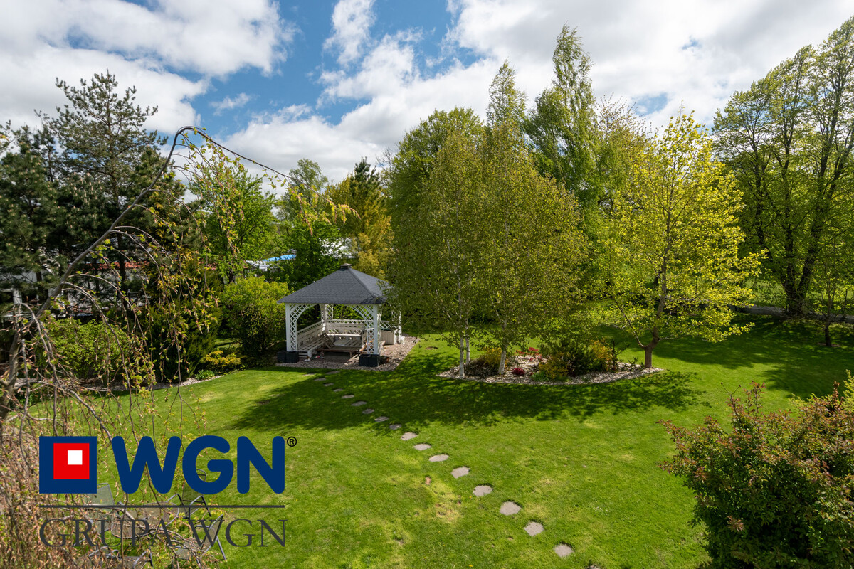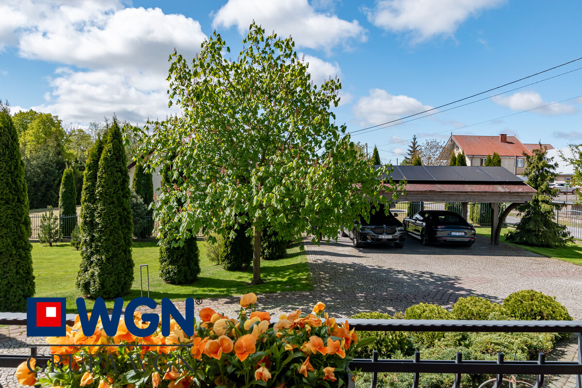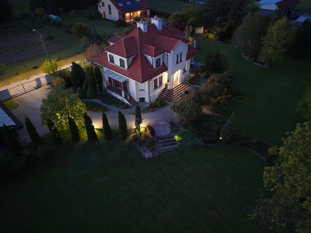 W ogrodzie znajdziemy piękne nasadzenia, do których właściciele przywiązują dużą wagę, dzięki czemu cały teren jest przemyślany, piękny i kolorowy. Tutaj nie ma przypadku, każda roślina, czy drzewo dodaje uroku tej wyjątkowej nieruchomości. Cały ogród jest oświetlony nowoczesnymi lampami, które wieczorem dodają niezwykłego klimatu temu miejscu. Dodatkowo w ogrodzie znajduje się duża pergola z meblami ogrodowymi do wypoczynku, tutaj po prostu chcesz się zrelaksować i odpocząć.