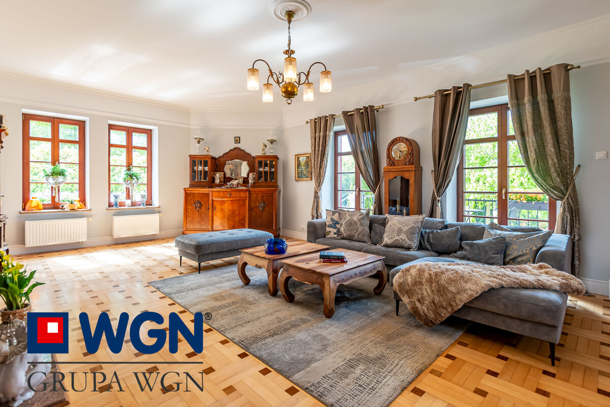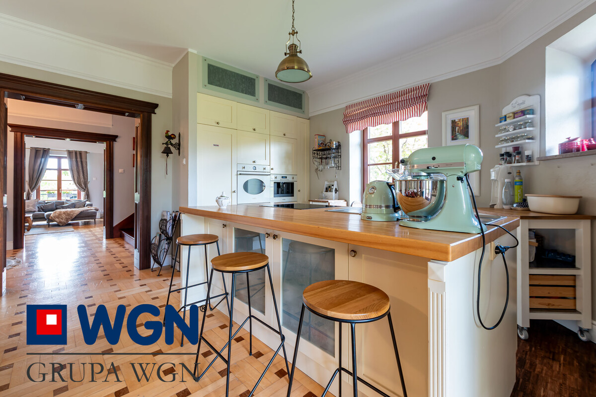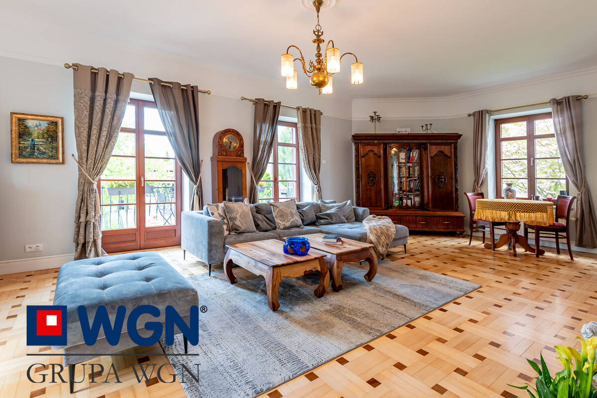 Wnętrze budynku w wysokim standardzie, stolarka drzwiowa oraz okienna drewniana w bardzo dobrym stanie. Na podłogach klepka drewniana oraz panele drewniane, schody obłożone drewnem, parapety z naturalnego kamienia ( trawertyn). Wykończenie łazienki na 2 kondygnacji z płyt marmurowych. W ostatnich 3 latach wnętrze domu przeszło generalny remont, pomieszczenie po pomieszczeniu. Właściciele zmienili układ funkcjonalny parteru dzięki czemu obecnie na tej kondygnacji znajduje się :
