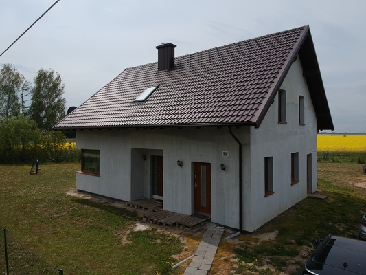 Dach ocieplony wełną, elewacja ocieplona, woda i prąd w miejscu. Budynek wybudowany w 2024 roku, gotowy do zamieszkania.