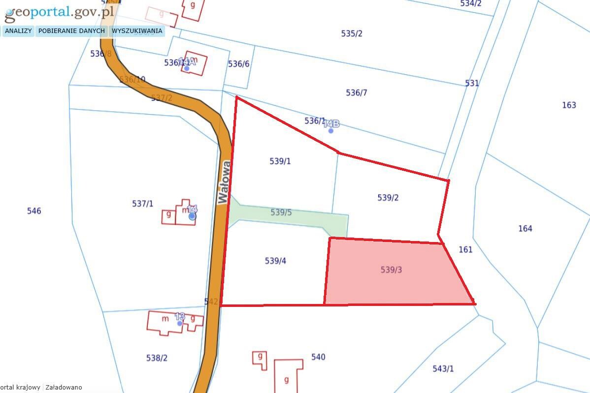 Wodociąg i prąd dostępne w drodze głównej Dojazd: droga wewnętrzna nr 539/5 (udział w cenie)