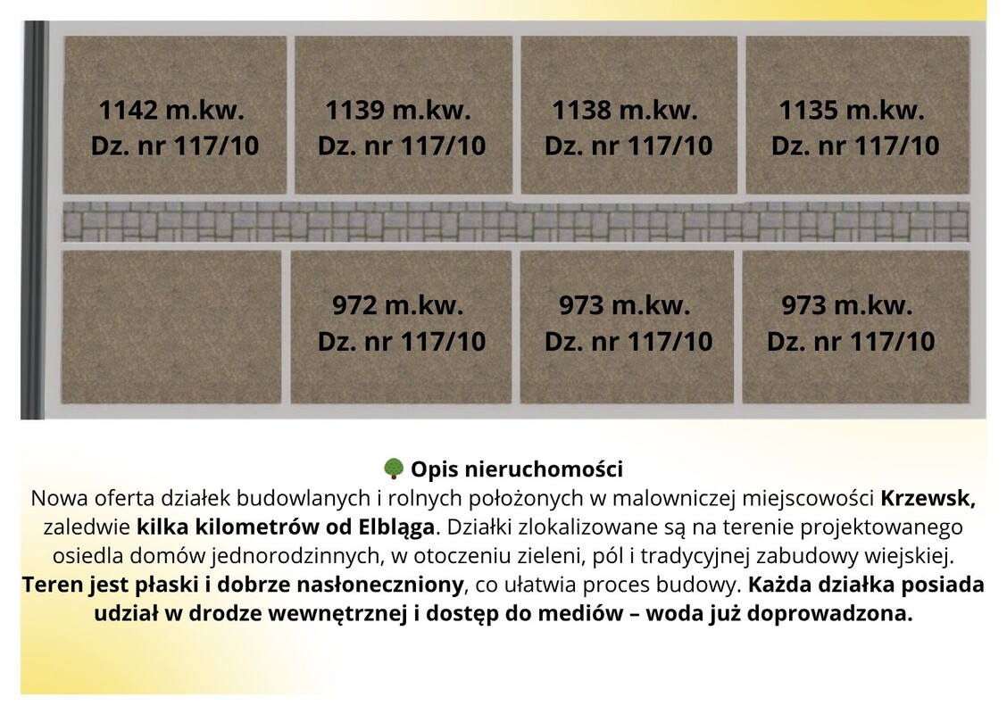 Odkryj wyjątkowe działki budowlane i rolne w malowniczej miejscowości Krzewsk, zaledwie kilka minut jazdy od Elbląga! Teren znajduje się wśród zieleni, na obszarze projektowanego osiedla domów jednorodzinnych – idealne miejsce dla rodzin i inwestorów poszukujących spokoju, kontaktu z naturą oraz wygodnego dostępu do miasta.