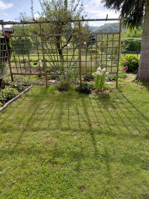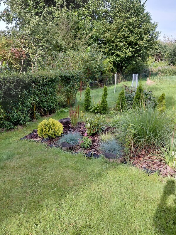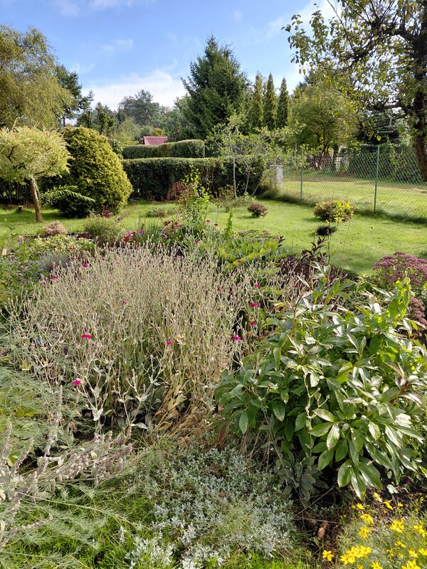 - zadbana, ogrodzona, z licznymi nasadzeniami (drzewa owocowe, krzewy, kwiaty),