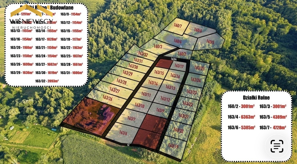 Działki rolno-budowlane widoczne na planszy: 163/7 – 1155 m², 163/9 – 1154 m², 163/10 – 1155 m², 163/11 – 1155 m², 163/12 – 1154 m², 163/13 – 1155 m², 163/14 – 1155 m², 163/15 – 1155 m², 163/16 – 1154 m², 163/17 – 1028 m², 163/19 – 1177 m², 163/20 – 1160 m², 163/21 – 1159 m², 163/22 – 1163 m², 163/23 – 1150 m², 163/24 – 1154 m², 163/25 – 1037 m², 163/26 – 1699 m², 163/27 – 1682 m², 163/28 – 1661 m², 163/29 – 1636 m², 163/30 – 1619 m², 163/31 – 1606 m², 163/32 – 2093 m².