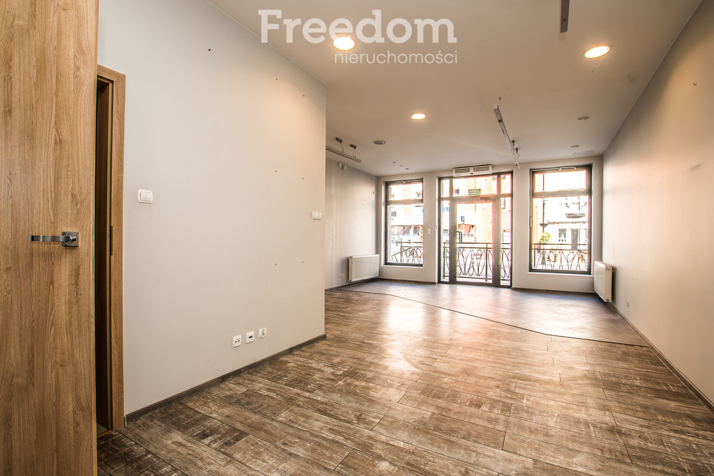 Two large display windows and a glass entrance door from the main entrance, plus an additional entrance from the back. Open space with flexible layout options, currently divided into a main room (partially glazed partitions), an office, a break room, and a toilet. The walls and floors are finished to a high standard. Rent is subject additional administrative fee of approximately 600 PLN per month, which covers advance payments for heating, water, and property management fees. A security deposit is required.
