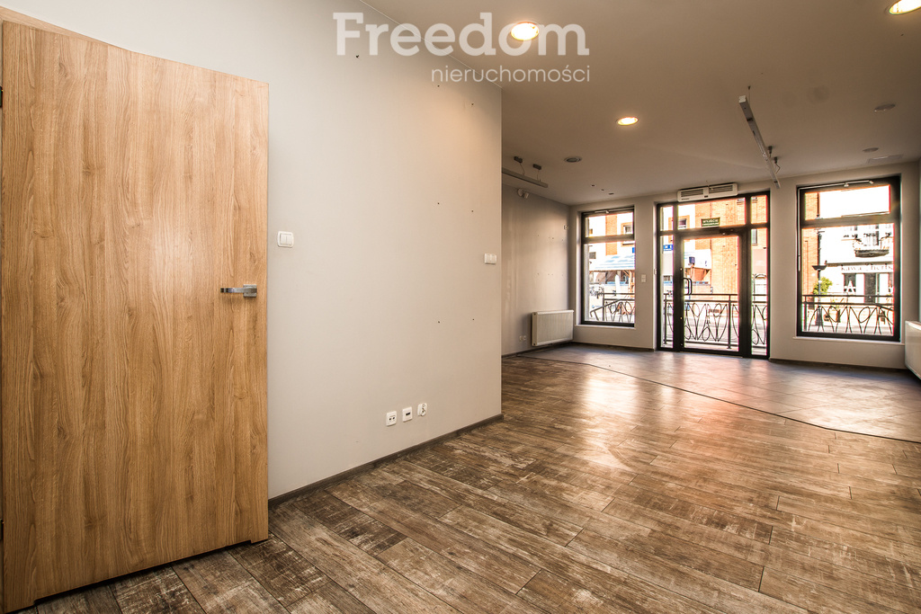 Dwie duże witryny i przeszklone drzwi wejściowe ze strony głównego wejścia oraz dodatkowe wejście od strony zaplecza. Otwarta przestrzeń do dowolnej aranżacji, obecnie wydzielona została główna sala (częściowo przeszklone ścianki działowe) i gabinet oraz pomieszczenie socjalne i wc. Wysoki standard wykończenia ścian i podłóg. Do czynszu najmu należy doliczyć opłatę administracyjna wynosząca ok. 600 złotych miesięcznie, obejmująca zaliczki na energię cieplną, zaliczki na wodę i koszty zarządcy. Wymagana kaucja gwarancyjna.