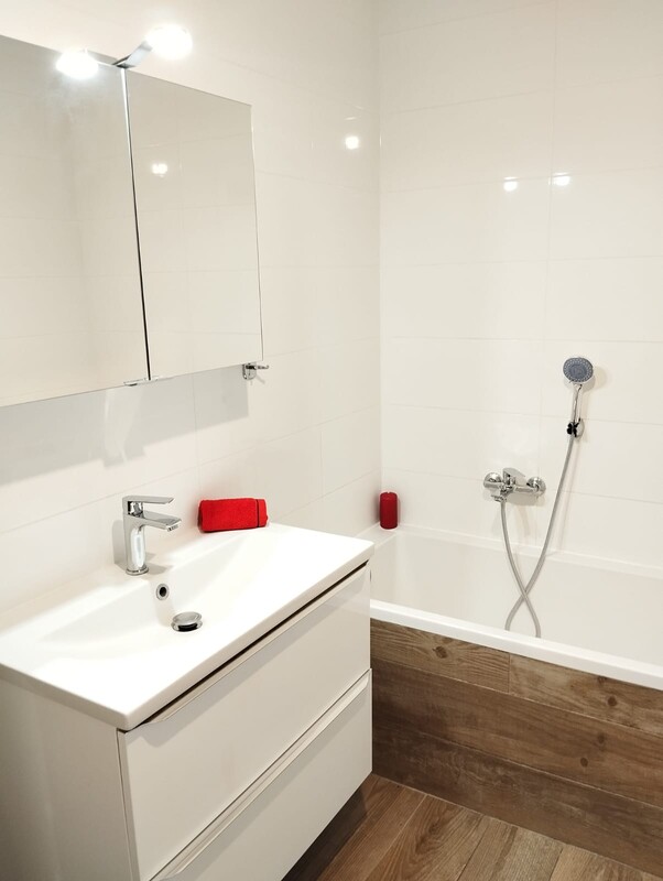 Kuchnia funkcjonalnie wyposażona. Łazienka z ładnymi kafelkami i wanną.
