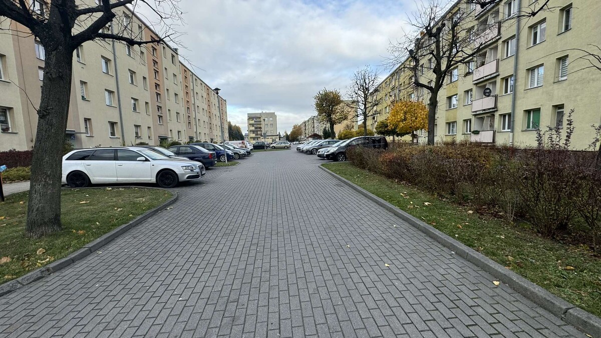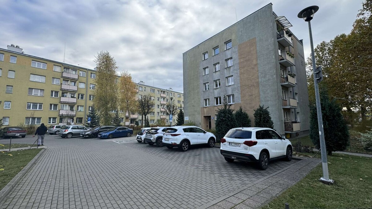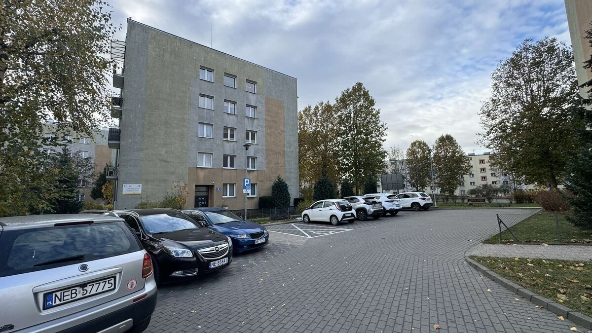 Przed budynkiem znajduje się parking z dużą ilością miejsc.