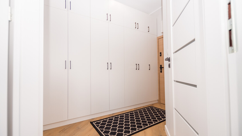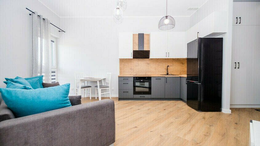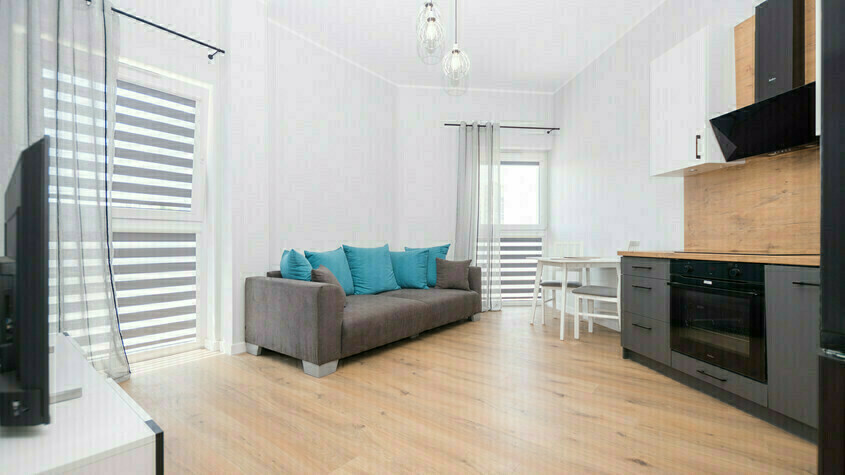 Nieruchomość składa się z salonu z aneksem kuchennym, sypialni, łazienki z wc oraz przedpokoju. Nowoczesna kuchnia w zabudowie z wyposażeniem AGD takim jak: lodówka, zmywarka, piekarnik elektryczny, płyta indukcyjna, okap. Na przedpokoju znajduje się duża i pojemna zabudowa pełniąca funkcję garderoby.