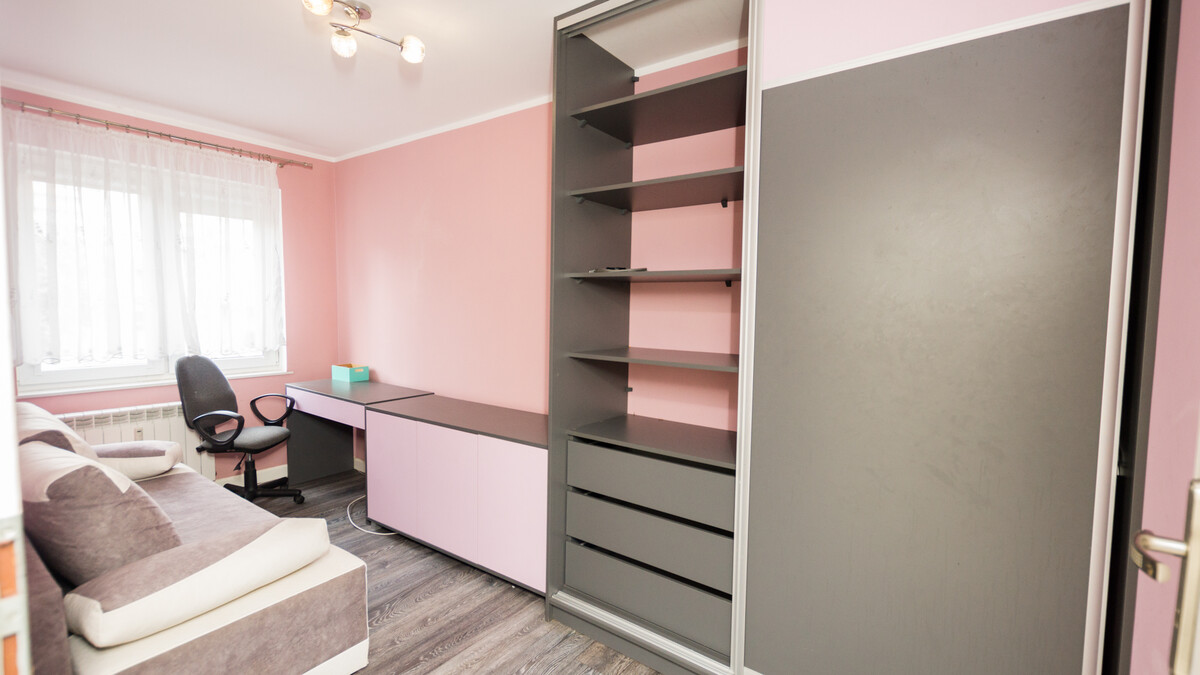 Mieszkanie składa się z dużego pokoju z wraz z wyjściem na balkon, dwóch mniejszych pokoi, oddzielnej, wyposażonej kuchni, łazienki, osobnego wc oraz przedpokoju. W przedpokoju duża i pojemna szafa w zabudowie.