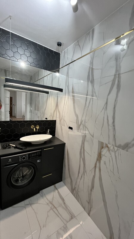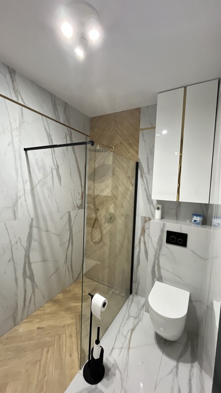 Mieszkanie zostało wykończone w nowoczesnym stylu z użyciem wysokiej jakości materiałów. W jego skład wchodzą:
