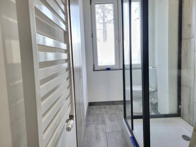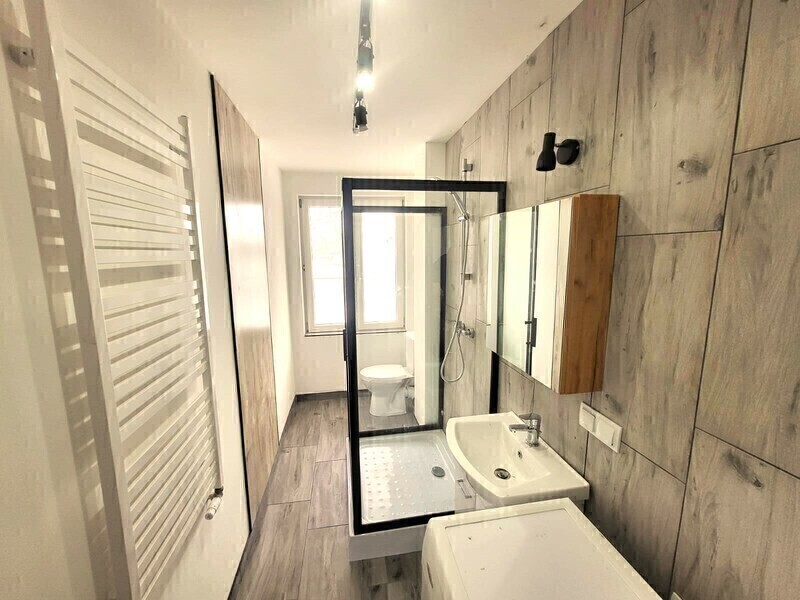 Łazienka z kabiną prysznicową z dużym oknem zapewnia całodzienne naturalne doświetlenie. Na ścianach położono gustowne kafle które doskonale harmonizują z podłogą. Opłaty dla zarządcy przy zamieszkałej jednej osobie to 400 zł.