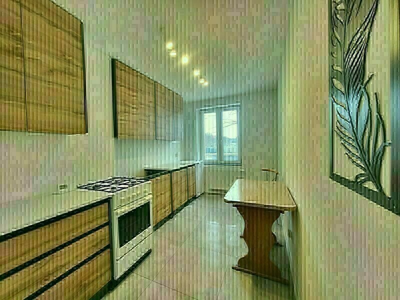 Kuchnia z oknem wyposażona jest w; płytę gazową, okap, lodówkę z zamrażarką. Zabudowy wykonane są z frontów w modnym kolorze imitującym drewno.