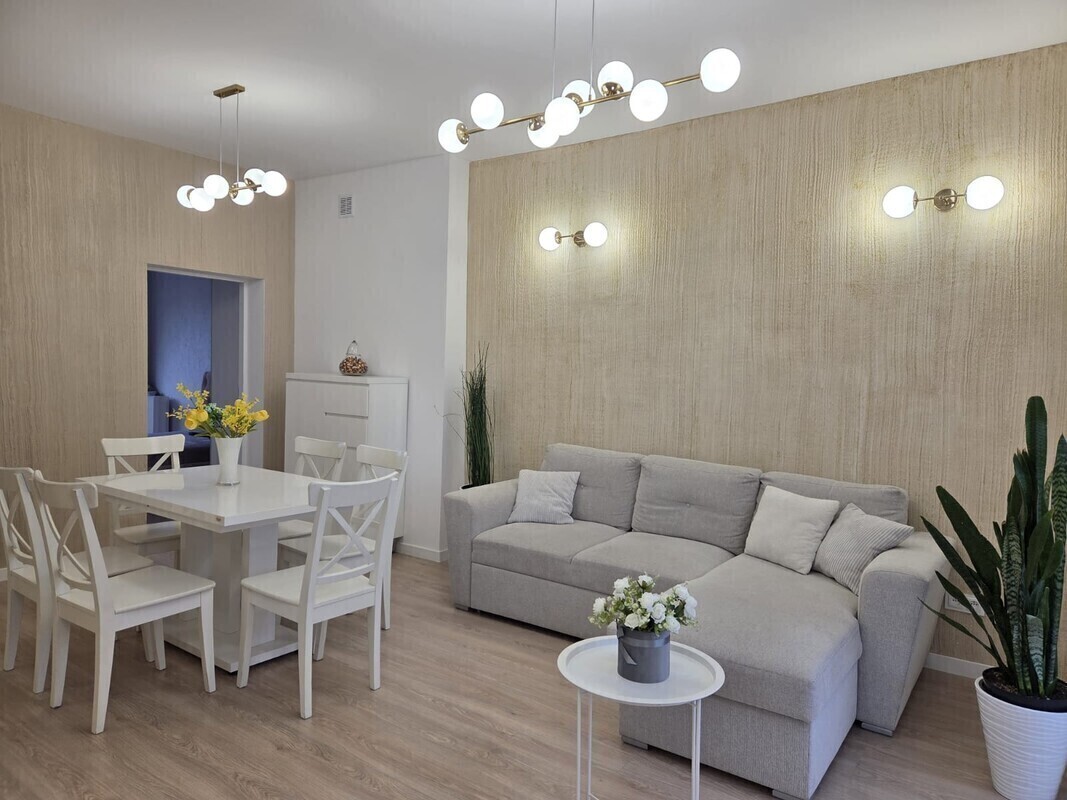 W mieszkaniu położono na podłogach efektowne podłogi, na ścianach gładż szpachlowa.