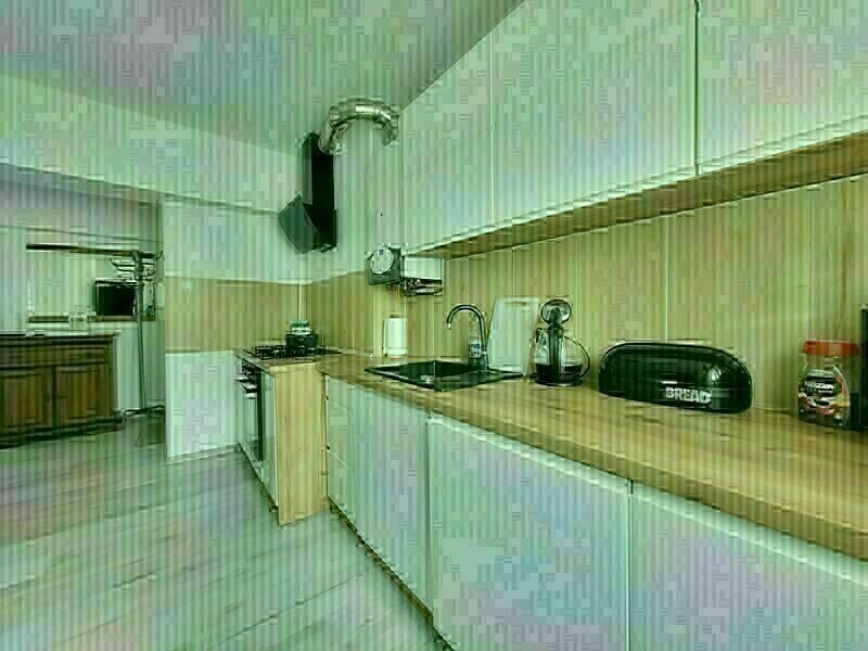 Kuchnia z oknem wyposażona jest w; płytę gazową, okap, lodówkę z zamrażarką. Zabudowy wykonane są z lakierowanych, białych frontów.