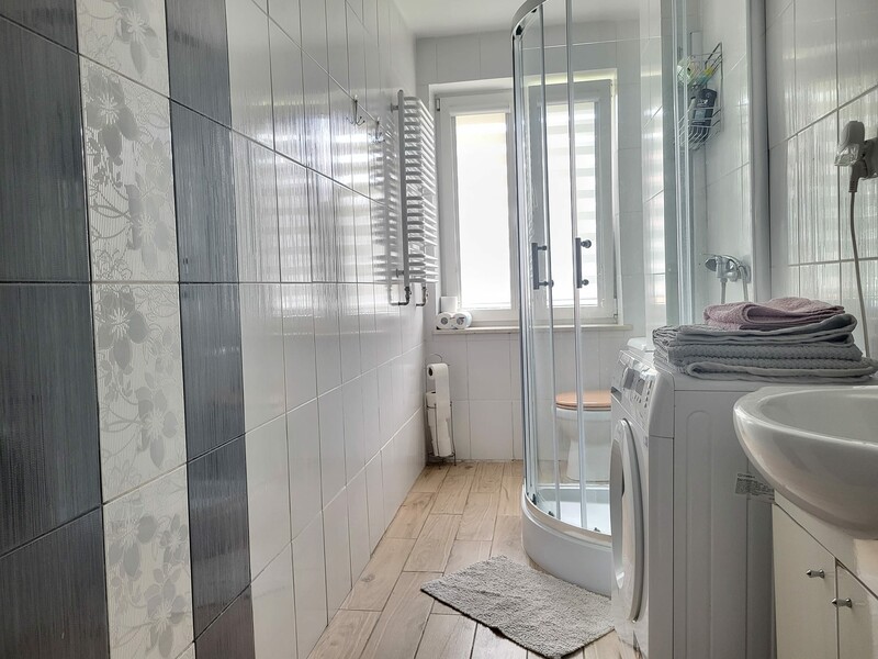 Łazienka z kabiną prysznicową z dużym oknem zapewnia całodzienne naturalne doświetlenie. Na ścianach położono gustowne kafle które doskonale harmonizują z podłogą. Opłaty dla zarządcy przy zamieszkałej jednej osobie to 450 zł.