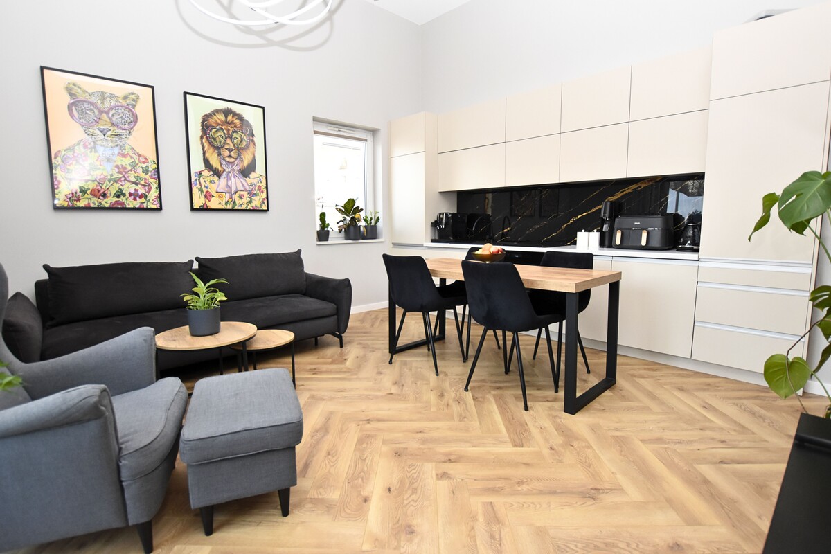 - przestronny salon połączony z nowoczesnym aneksem kuchennym