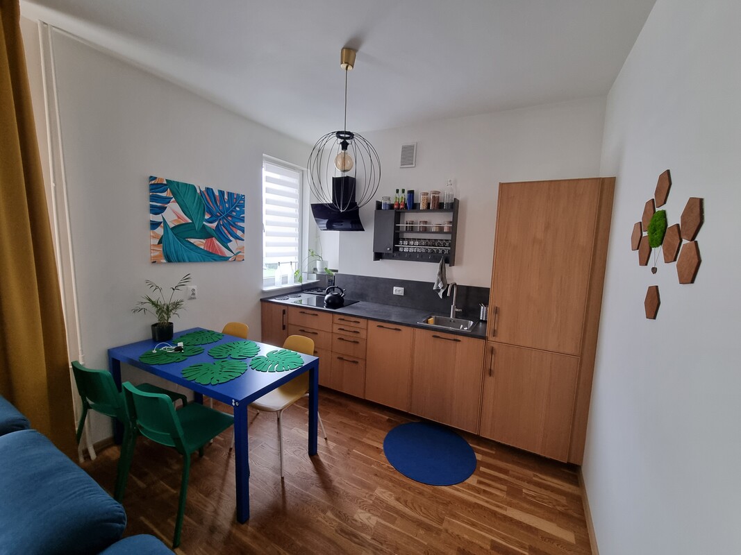 - kuchnia (zmywarka, lodówka, mikrofalówka, stół, krzesła - widoczne meble na zdjęciach)