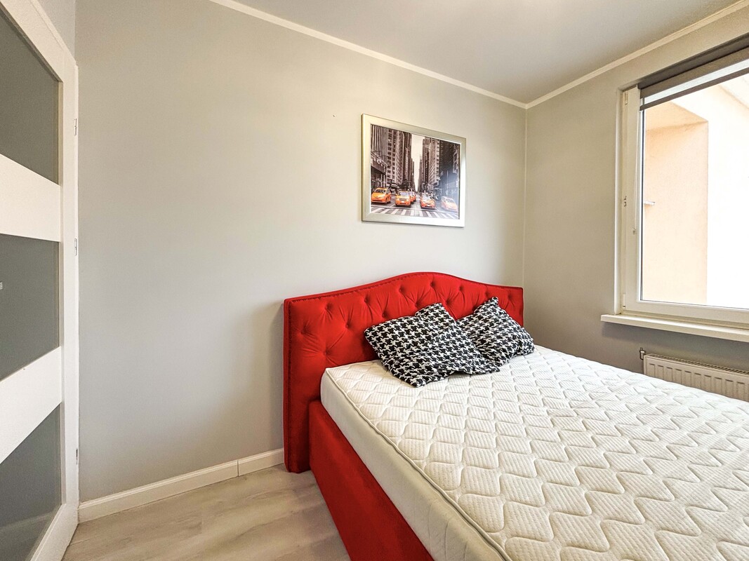 Mieszkanie składa się z pokoju dziennego z aneksem kuchennym, sypialni, łazienki oraz przedpokoju. Lokal jest nowocześnie urządzony, w pełni umeblowany i wyposażony we wszystkie niezbędne meble oraz sprzęt AGD.