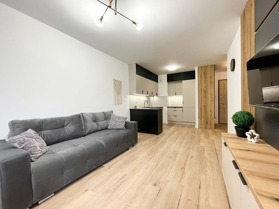Przedmiotem oferty jest atrakcyjne mieszkanie na wynajem, zlokalizowane na parterze nowoczesnego apartamentowca z reprezentacyjną recepcją. Budynek wyróżnia się elegancką architekturą oraz wysokim standardem części wspólnych. Apartament został urządzony w nowoczesnym stylu, z wykorzystaniem wysokiej jakości materiałów oraz nowoczesnych zabudów meblowych wykonanych na wymiar. Wnętrze jest w pełni wyposażone i gotowe do zamieszkania, zarówno w sprzęt AGD, jak i funkcjonalne umeblowanie, zapewniające komfort codziennego użytkowania. Do dyspozycji najemcy pozostaje również miejsce postojowe w hali garażowej, co stanowi istotny atut tej oferty.