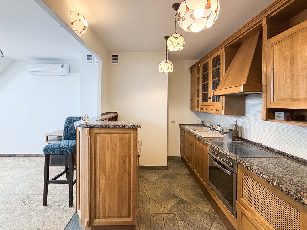 Stylowa przestrzeń z drewnem orzechowym, sztukaterią, designerskimi lampami i efektowną witryną. Centralny punkt apartamentu.