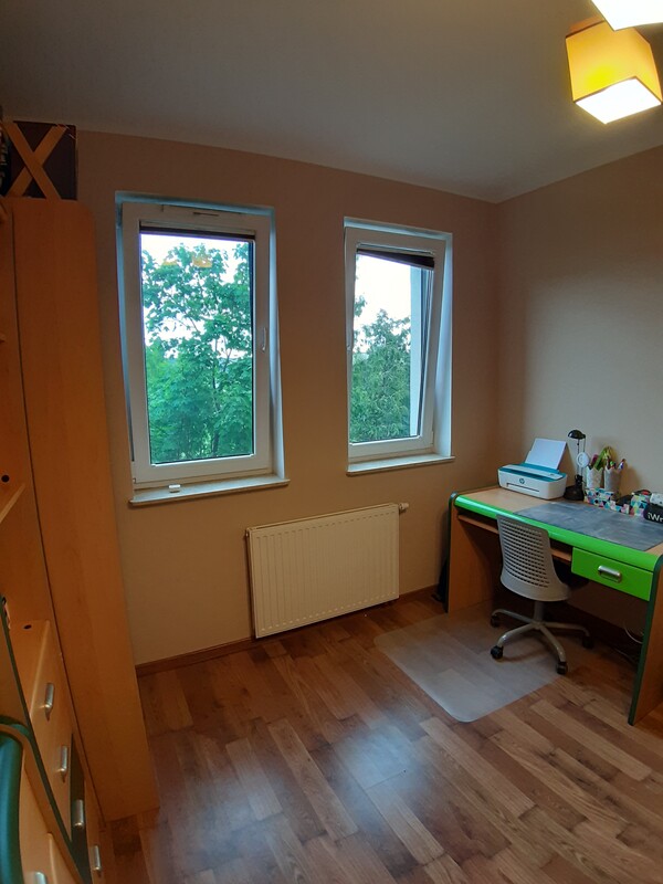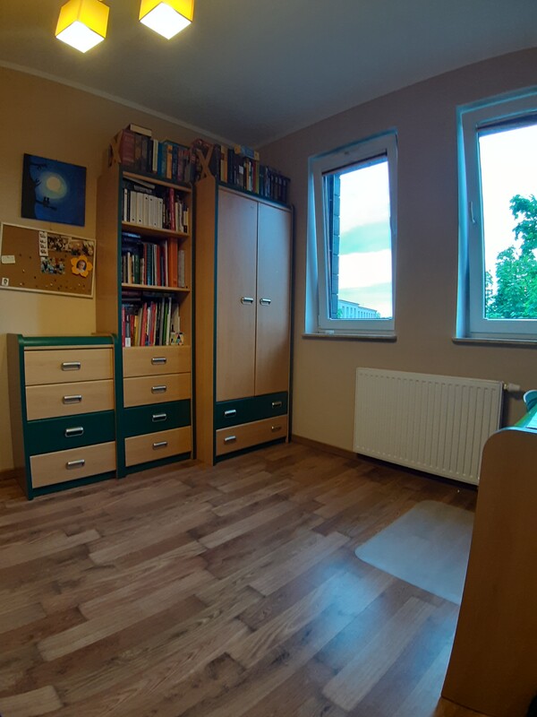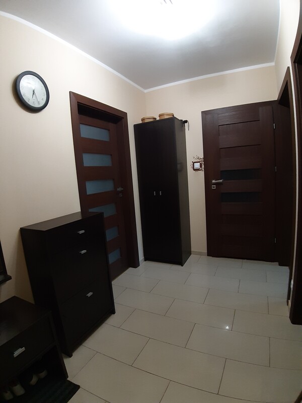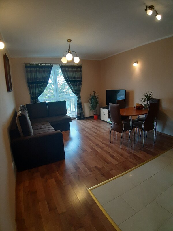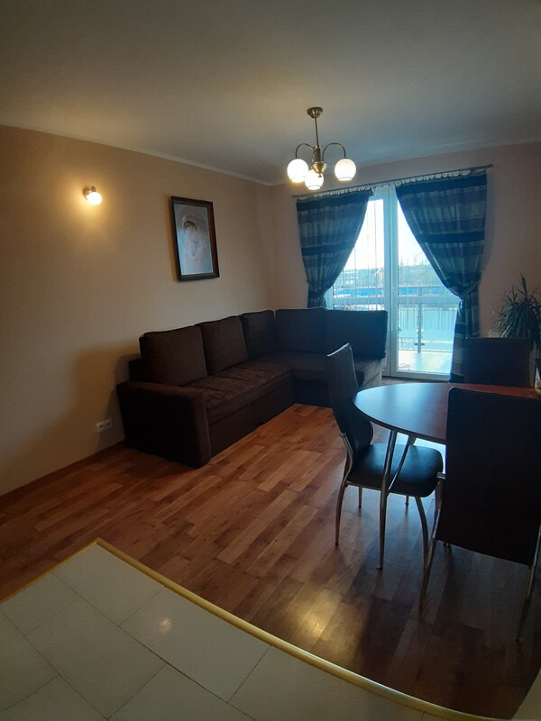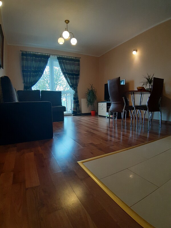 Mieszkanie jest w pełni umeblowanie i wyposażone w sprzęt AGD, składa się z salonu połączonego z aneksem kuchennym oraz wyjściem na balkon, dwóch pokoi, łazienki i przedpokoju. Mieszkanie jest ciepłe i słoneczne, wszystkie media są z miasta. Do kamienicy przynależy bezpłatny parking samochodowy zamykany szlabanem oraz niewielki plac zabaw w otulinie zieleni.