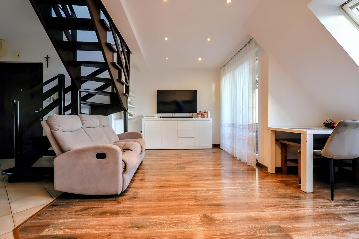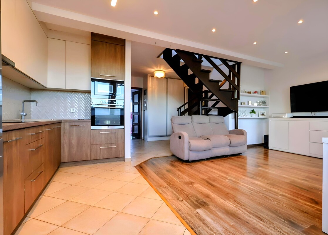 - Przestronny salon z aneksem kuchennym i wyjściem na balkon