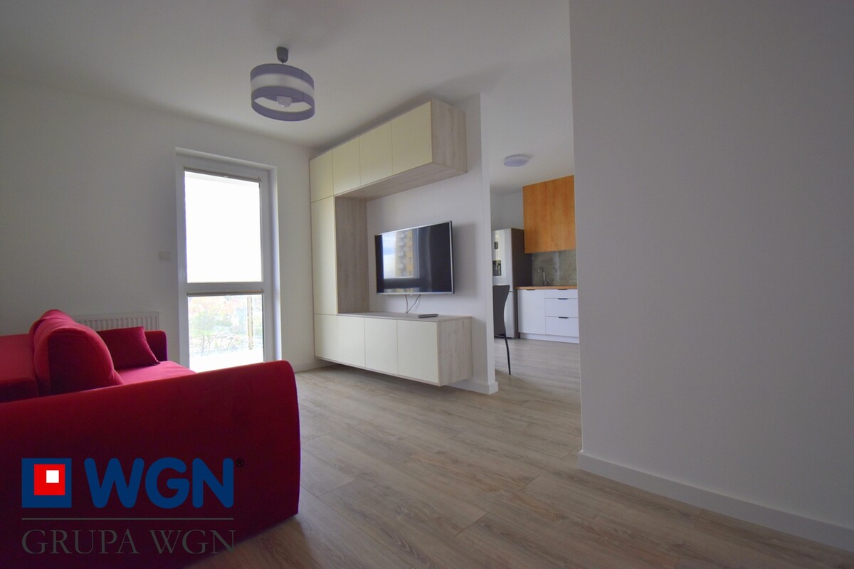 Dwa pokoje, kuchnia wyposażona w sprzęt AGD lodówka, płyta indukcyjna, piekarnik, zmywarka, łazienka z dużą kabiną prysznicową i pralką. W mieszkaniu jest również duża garderoba co pozwala na przechowywanie wszystkiego a także w sypialni duża trzydrzwiowa zabudowana szafa. Bardzo duży taras 9 metrów z przepięknym widokiem na panoramę miasta. Do mieszkania przynależy komórka lokatorska o powierzchni 5 metrów. Istnieje również możliwość korzystania z miejsca postojowego pod budynkiem w cenie 300 zł miesięcznie.