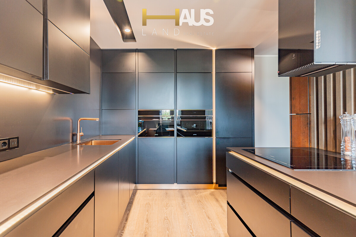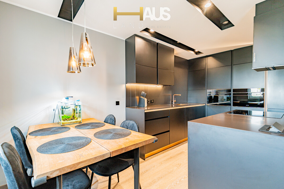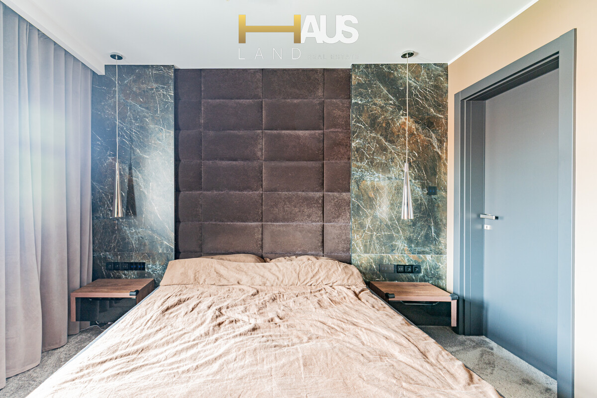 - Wykończenie w standardzie premium - wysokiej klasy materiały, m. in. spiek kwarcowy, kamienne blaty, meble na wymiar i klimatyzacja – mieszkanie urządzone z dbałością o każdy detal,