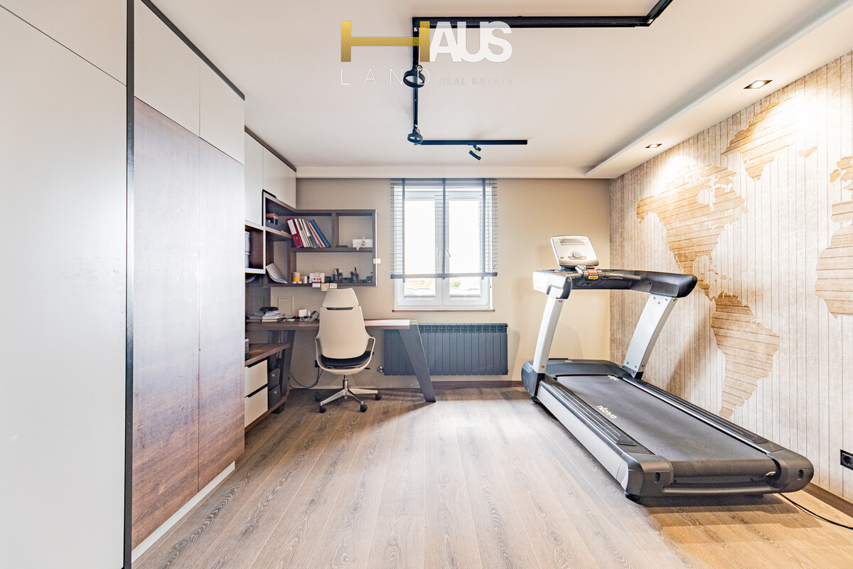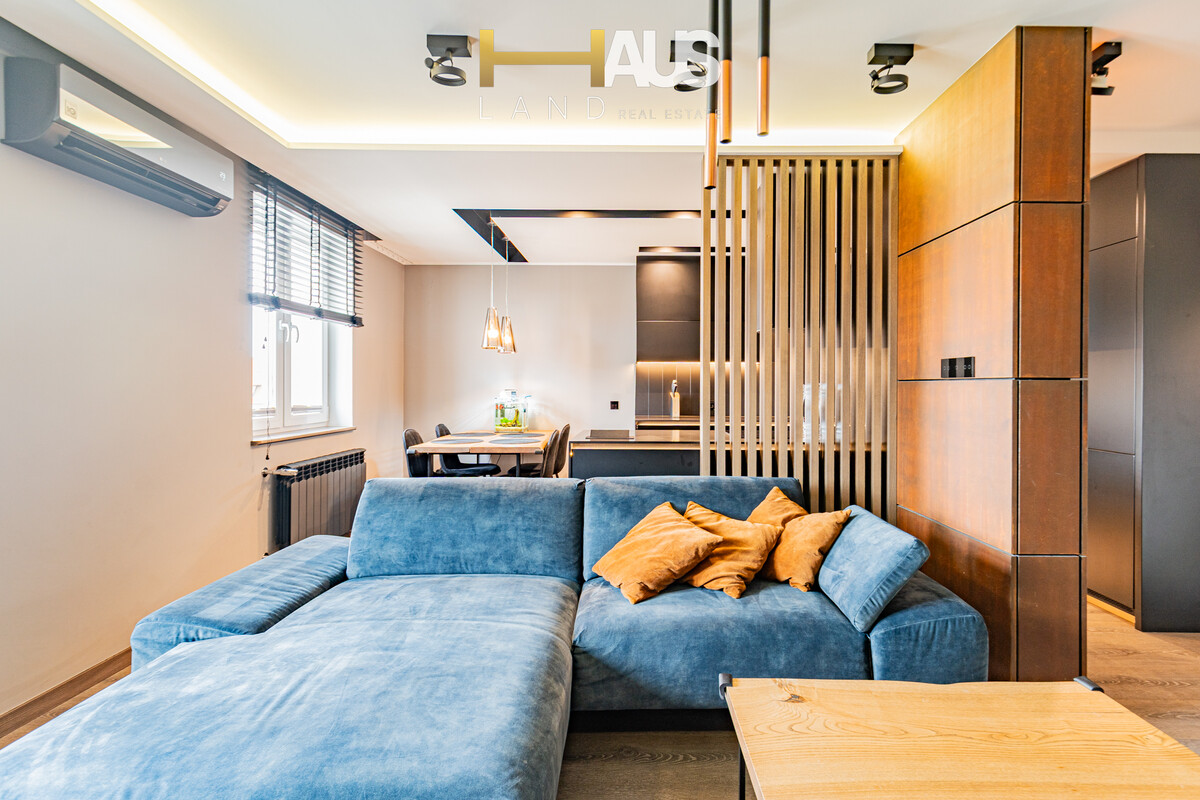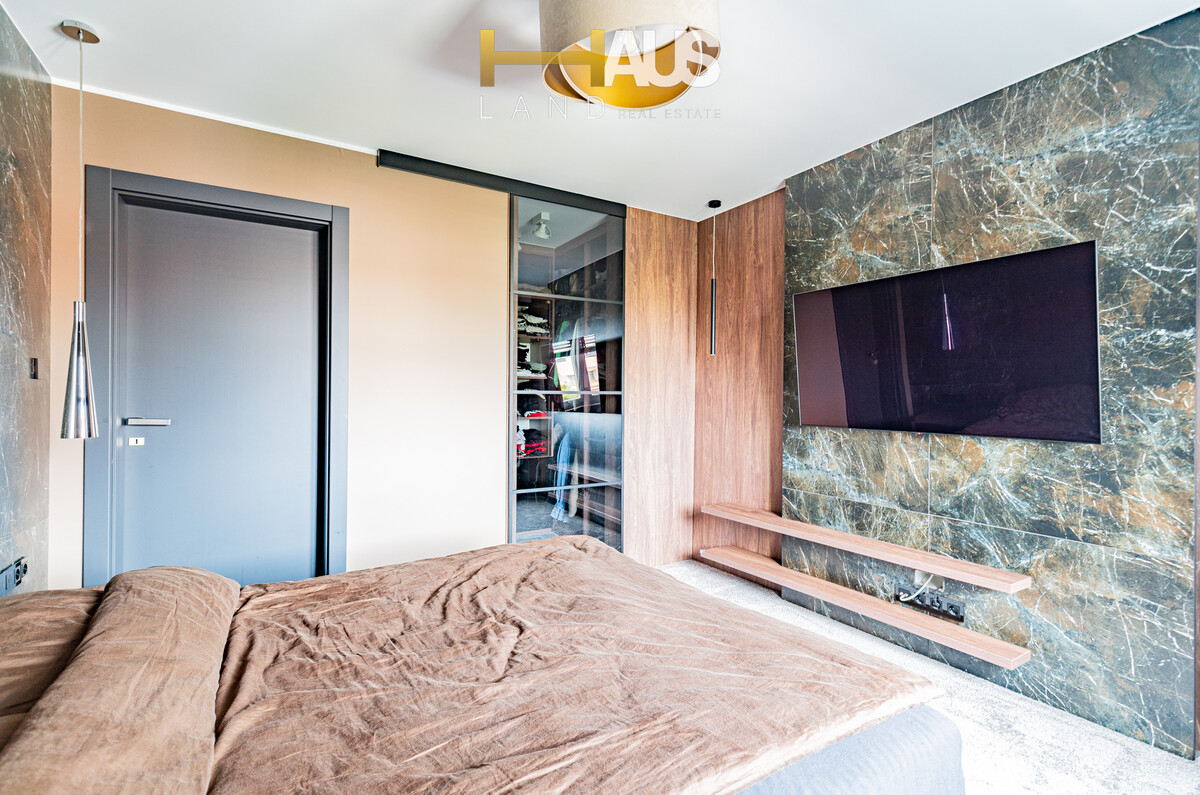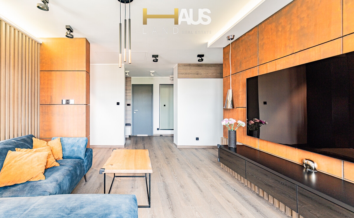 - Wykończenie w standardzie premium - wysokiej klasy materiały, m. in. spiek kwarcowy, kamienne blaty, meble na wymiar i klimatyzacja – mieszkanie urządzone z dbałością o każdy detal,