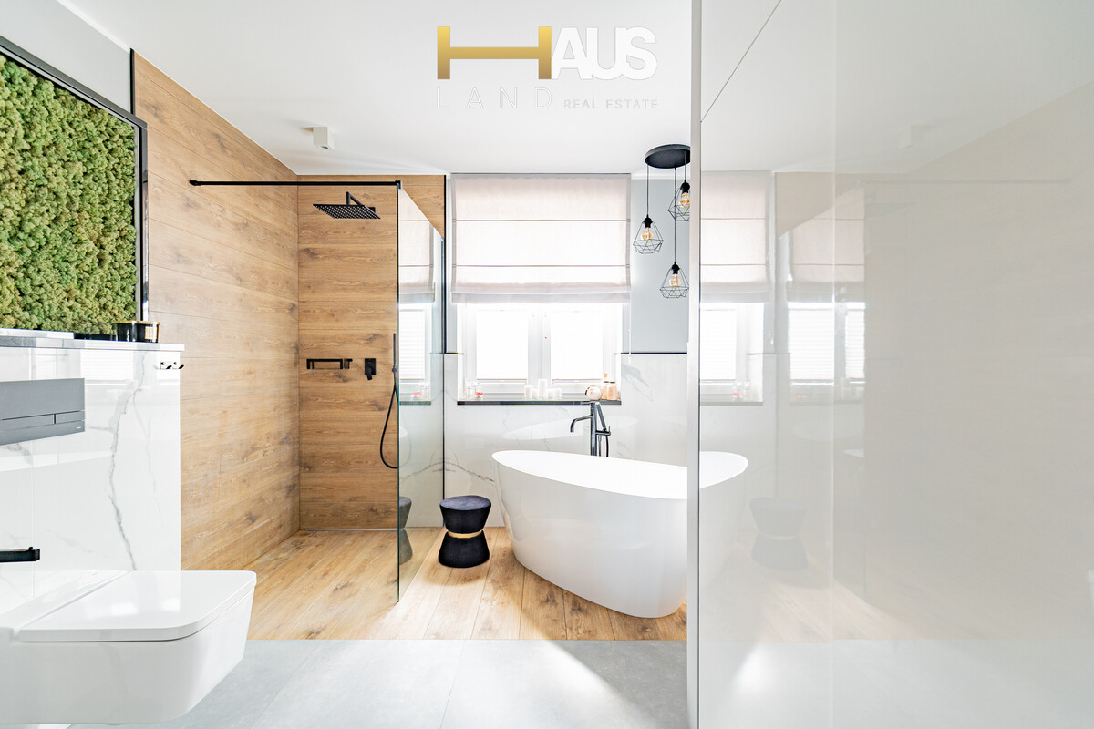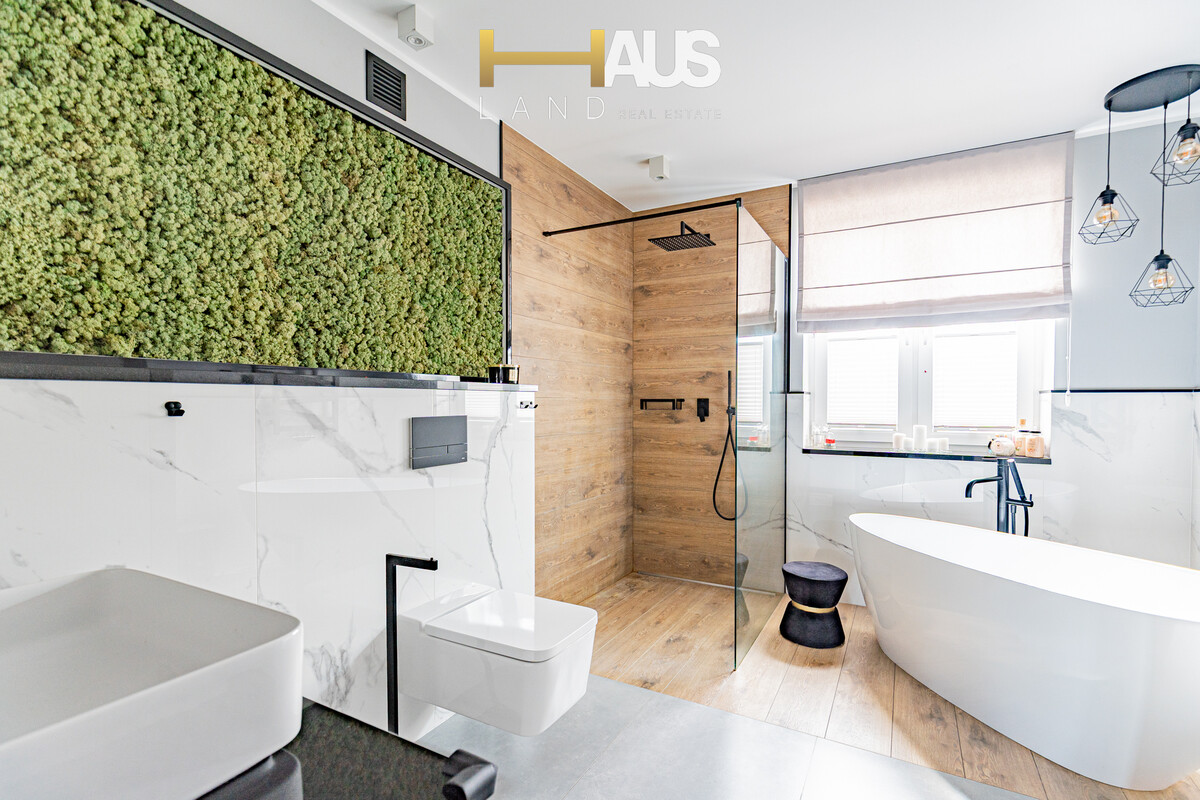 - Duża, luksusowa łazienka z wanną i prysznicem walk-in - nowoczesne ogrzewanie podłogowe, eleganckie meble w zabudowie i dużo miejsca do przechowywania – wszystko przemyślane pod kątem komfortu,