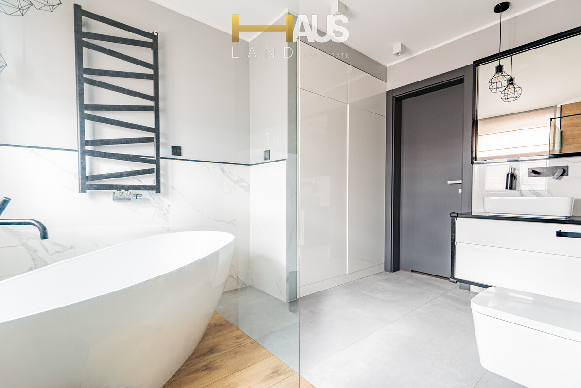 Łazienka to kolejny mocny punkt tej nieruchomości – wyjątkowo przestronna i luksusowo urządzona. Znajdziemy tu zarówno wolnostojącą wannę, jak i prysznic typu walk-in. Blat kamienny przy umywalce, pojemne szafy w zabudowie (z ukrytą pralką) oraz elektryczne ogrzewanie podłogowe – to detale, które podnoszą codzienny komfort użytkowania.