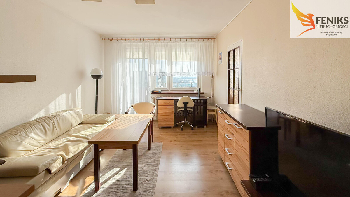 Lokal o powierzchni 32,2 m² znajduje się na ostatnim, 10.piętrze wieżowca, co stanowi atut nieruchomości. Z balkonu rozpościera się szeroki widok na otwartą przestrzeń i obrzeża miasta, a położenie na najwyższej kondygnacji zapewnia większą ilość światła dziennego oraz przyjemną, panoramiczną perspektywę. Mieszkanie ma jednostronną wystawę okien i składa się z przestronnego pokoju dziennego, osobnej kuchni, łazienki z wanną oraz przedpokoju z szafą w zabudowie. Do lokalu przynależy piwnica. Nieruchomość jest zadbana i przytulna, nie wymaga większych nakładów finansowych – ewentualne prace mogą ograniczyć się do odświeżenia według własnych preferencji. Mieszkanie sprzedawane jest z pełnym wyposażeniem – w cenie pozostają meble oraz sprzęty AGD, co umożliwia natychmiastowe zamieszkanie lub rozpoczęcie wynajmu bez dodatkowych inwestycji. Wszystkie media są z sieci miejskiej. Czynsz administracyjny wynosi około 700 zł miesięcznie. Przy budynku dostępny jest parking dla mieszkańców. To dobra propozycja zarówno jako pierwsze mieszkanie, jak i pod inwestycję na wynajem.