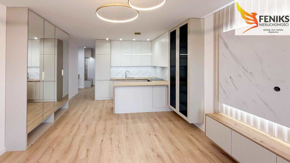 Nowe mieszkanie znajduje się w końcowej fazie remontu i zostało zaprojektowane z myślą o wygodzie oraz nowoczesnej stylistyce. Składa się z przestronnego salonu połączonego z kuchnią w kształcie litery U, z którego prowadzi wyjście na dużą loggię. Do dyspozycji jest również komfortowa łazienka z WC, funkcjonalny przedpokój oraz dodatkowy pokój, który idealnie sprawdzi się jako sypialnia lub pokój dziecięcy. Całość składa się na 50,5 m2.Dzięki dwustronnej ekspozycji okien — na północny wschód i południowy zachód — wnętrza są jasne i dobrze doświetlone. Wnętrza mieszkania prezentują się wyjątkowo nowocześnie i funkcjonalnie, utrzymane w spokojnej, jasnej kolorystyce. W salonie z aneksem kuchennym stylizowanym na literę U dominują naturalne wykończenia – jasne fronty, drewniane blaty i subtelne dekoracje ścienne. Eleganckie okrągłe żyrandole sprawiają, że przestrzeń nabiera lekkości. Loggia z widokiem na otaczającą zieleń dodaje wnętrzom przestronności i świeżości. W przedpokoju znajduje się pojemna zabudowa – duża szafa z lustrzanymi frontami optycznie powiększa przestrzeń. Tuż przy drzwiach zaaranżowano praktyczne siedzisko i ścianę tapicerowaną, tworząc idealne miejsce na szybkie zakładanie butów. Dodatkowa zabudowa pod siedziskiem zwiększa funkcjonalność tej strefy. Pokój mogący pełnić funkcję sypialni lub pokoju dziecięcego charakteryzuje się tapicerowaną ścianą oraz dużą szafą z pawlaczem – całość utrzymano w ciepłej, neutralnej tonacji i minimalistycznym stylu. Łazienka zachwyca wykończeniem w odcieniach bieli i szarości o subtelnym, marmurowym wzorze. Głównym elementem wyposażenia jest wanna z eleganckim przeszkleniem, która dzięki zintegrowanej deszczownicy pełni również funkcję kabiny prysznicowej. Całość dopełniają złote baterie, nowoczesna szafka pod umywalkę i duże, okrągłe lustro, tworząc komfortową i stylową przestrzeń do codziennego relaksu. W cenie mieszkania zawarte są wszystkie stałe elementy wyposażenia włącznie z urządzeniami AGD, takimi jak: zmywarka, lodówka, kuchenka i piekarnik. Mieszkanie będzie dostępne do wydania w styczniu 2026 roku, ponieważ jest obecnie w trakcie wykończenia. Po zakończeniu prac będzie wyglądać tak, jak na zdjęciach, które przedstawiają mieszkanie o takim samym układzie.