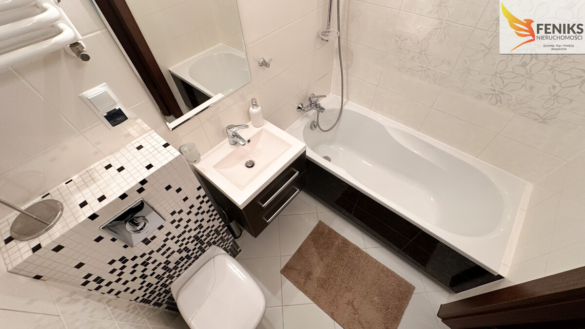 Łazienka z WC wyposażona jest w wannę oraz nowoczesne kafelki. W przedpokoju i kuchni zastosowano duże, jasne kafle, które nadają mieszkaniu nowoczesności i wydzielają strefy mieszkania. W pokojach znajdują się panele wysokiej jakości. Kuchnia jest w pełni wyposażona w sprzęt agd w tym zmywarkę, meble zadbane wykonane na wymiar.