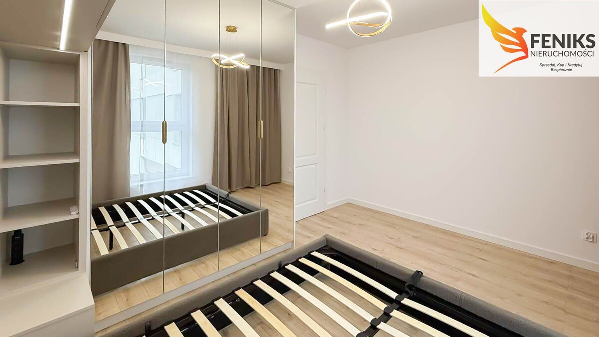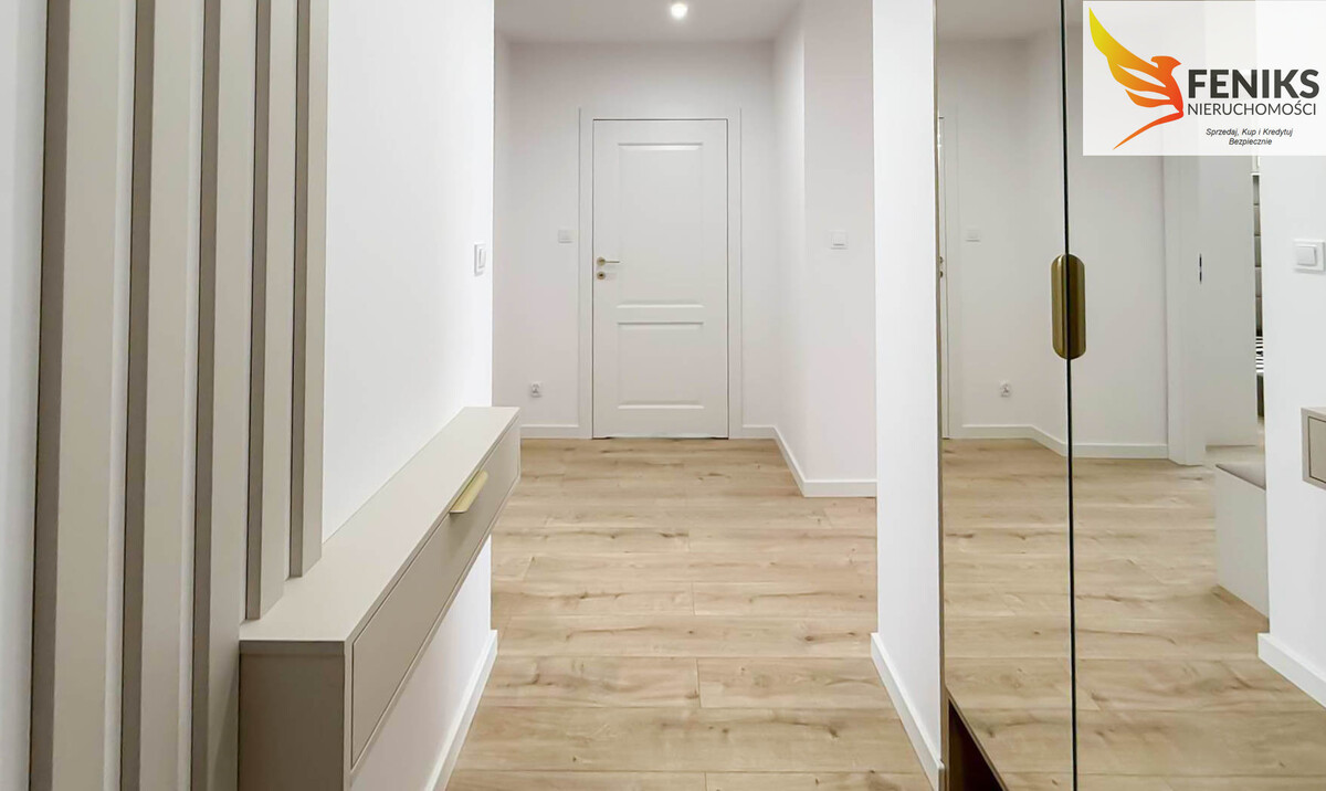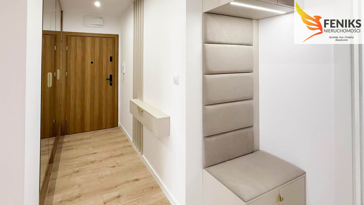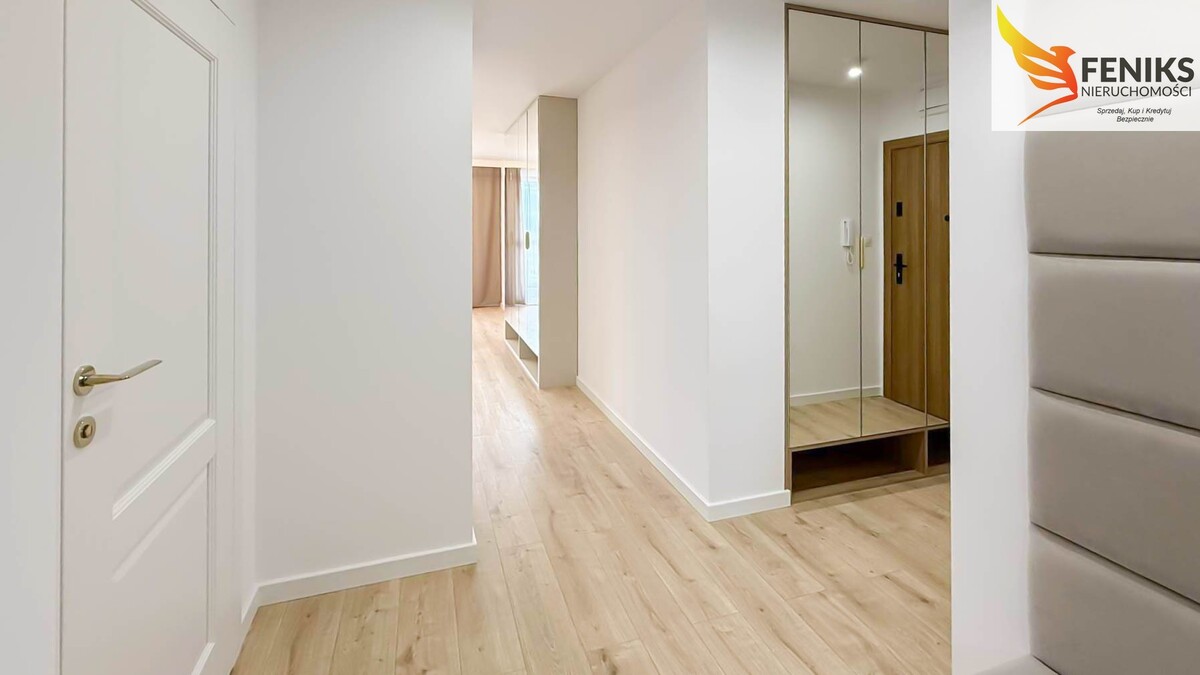 Nowe mieszkanie znajduje się w końcowej fazie remontu i zostało zaprojektowane z myślą o wygodzie oraz nowoczesnej stylistyce. Składa się z przestronnego salonu połączonego z kuchnią w kształcie litery U, z którego prowadzi wyjście na dużą loggię. Do dyspozycji jest również komfortowa łazienka z WC, funkcjonalny przedpokój oraz dodatkowy pokój, który idealnie sprawdzi się jako sypialnia lub pokój dziecięcy. Całość składa się na 50,5 m2.Dzięki dwustronnej ekspozycji okien — na północny wschód i południowy zachód — wnętrza są jasne i dobrze doświetlone. Wnętrza mieszkania prezentują się wyjątkowo nowocześnie i funkcjonalnie, utrzymane w spokojnej, jasnej kolorystyce. W salonie z aneksem kuchennym stylizowanym na literę U dominują naturalne wykończenia – jasne fronty, drewniane blaty i subtelne dekoracje ścienne. Eleganckie okrągłe żyrandole sprawiają, że przestrzeń nabiera lekkości. Loggia z widokiem na otaczającą zieleń dodaje wnętrzom przestronności i świeżości. W przedpokoju znajduje się pojemna zabudowa – duża szafa z lustrzanymi frontami optycznie powiększa przestrzeń. Tuż przy drzwiach zaaranżowano praktyczne siedzisko i ścianę tapicerowaną, tworząc idealne miejsce na szybkie zakładanie butów. Dodatkowa zabudowa pod siedziskiem zwiększa funkcjonalność tej strefy. Pokój mogący pełnić funkcję sypialni lub pokoju dziecięcego charakteryzuje się tapicerowaną ścianą oraz dużą szafą z pawlaczem – całość utrzymano w ciepłej, neutralnej tonacji i minimalistycznym stylu. Łazienka zachwyca wykończeniem w odcieniach bieli i szarości o subtelnym, marmurowym wzorze. Głównym elementem wyposażenia jest wanna z eleganckim przeszkleniem, która dzięki zintegrowanej deszczownicy pełni również funkcję kabiny prysznicowej. Całość dopełniają złote baterie, nowoczesna szafka pod umywalkę i duże, okrągłe lustro, tworząc komfortową i stylową przestrzeń do codziennego relaksu. W cenie mieszkania zawarte są wszystkie stałe elementy wyposażenia włącznie z urządzeniami AGD, takimi jak: zmywarka, lodówka, kuchenka i piekarnik. Mieszkanie będzie dostępne do wydania w styczniu 2026 roku, ponieważ jest obecnie w trakcie wykończenia. Po zakończeniu prac będzie wyglądać tak, jak na zdjęciach, które przedstawiają mieszkanie o takim samym układzie.