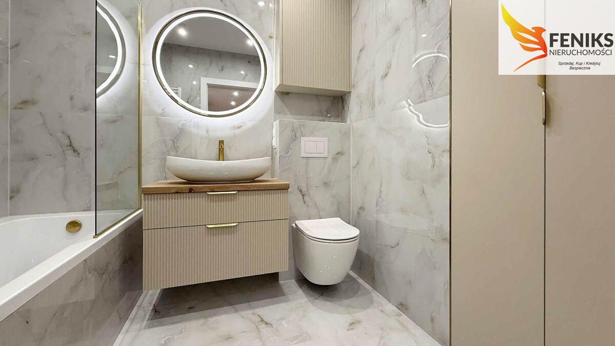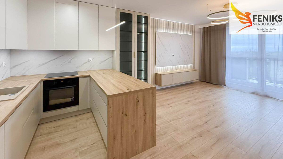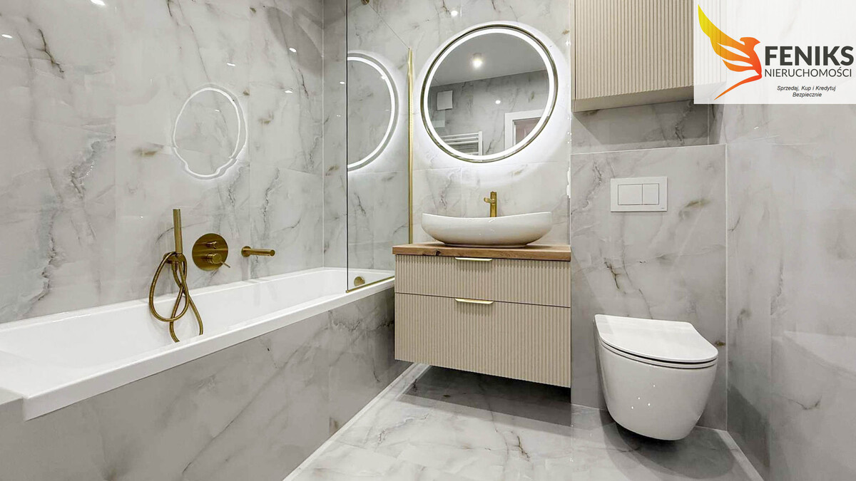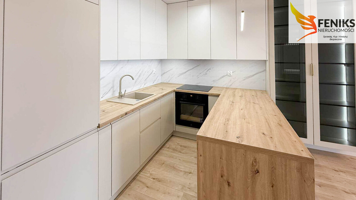 Nowe mieszkanie znajduje się w końcowej fazie remontu i zostało zaprojektowane z myślą o wygodzie oraz nowoczesnej stylistyce. Składa się z przestronnego salonu połączonego z kuchnią w kształcie litery U, z którego prowadzi wyjście na dużą loggię. Do dyspozycji jest również komfortowa łazienka z WC, funkcjonalny przedpokój oraz dodatkowy pokój, który idealnie sprawdzi się jako sypialnia lub pokój dziecięcy. Całość składa się na 50,5 m2.Dzięki dwustronnej ekspozycji okien — na północny wschód i południowy zachód — wnętrza są jasne i dobrze doświetlone. Wnętrza mieszkania prezentują się wyjątkowo nowocześnie i funkcjonalnie, utrzymane w spokojnej, jasnej kolorystyce. W salonie z aneksem kuchennym stylizowanym na literę U dominują naturalne wykończenia – jasne fronty, drewniane blaty i subtelne dekoracje ścienne. Eleganckie okrągłe żyrandole sprawiają, że przestrzeń nabiera lekkości. Loggia z widokiem na otaczającą zieleń dodaje wnętrzom przestronności i świeżości. W przedpokoju znajduje się pojemna zabudowa – duża szafa z lustrzanymi frontami optycznie powiększa przestrzeń. Tuż przy drzwiach zaaranżowano praktyczne siedzisko i ścianę tapicerowaną, tworząc idealne miejsce na szybkie zakładanie butów. Dodatkowa zabudowa pod siedziskiem zwiększa funkcjonalność tej strefy. Pokój mogący pełnić funkcję sypialni lub pokoju dziecięcego charakteryzuje się tapicerowaną ścianą oraz dużą szafą z pawlaczem – całość utrzymano w ciepłej, neutralnej tonacji i minimalistycznym stylu. Łazienka zachwyca wykończeniem w odcieniach bieli i szarości o subtelnym, marmurowym wzorze. Głównym elementem wyposażenia jest wanna z eleganckim przeszkleniem, która dzięki zintegrowanej deszczownicy pełni również funkcję kabiny prysznicowej. Całość dopełniają złote baterie, nowoczesna szafka pod umywalkę i duże, okrągłe lustro, tworząc komfortową i stylową przestrzeń do codziennego relaksu. W cenie mieszkania zawarte są wszystkie stałe elementy wyposażenia włącznie z urządzeniami AGD, takimi jak: zmywarka, lodówka, kuchenka i piekarnik. Mieszkanie będzie dostępne do wydania w styczniu 2026 roku, ponieważ jest obecnie w trakcie wykończenia. Po zakończeniu prac będzie wyglądać tak, jak na zdjęciach, które przedstawiają mieszkanie o takim samym układzie.