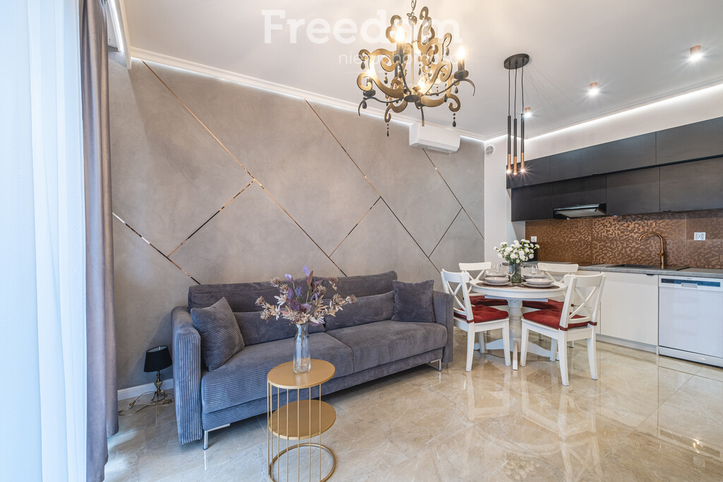The 37.29 m² apartment is located on the ground floor of a newly constructed building and comprises a living room with a kitchenette, a bedroom (both with access to a covered terrace of approximately 19.19 m², west-facing), and a bathroom with a shower. The apartment is air-conditioned and has exterior blinds. It is sold fully furnished and ready for immediate occupancy. An outdoor parking space is included for PLN 19,000.